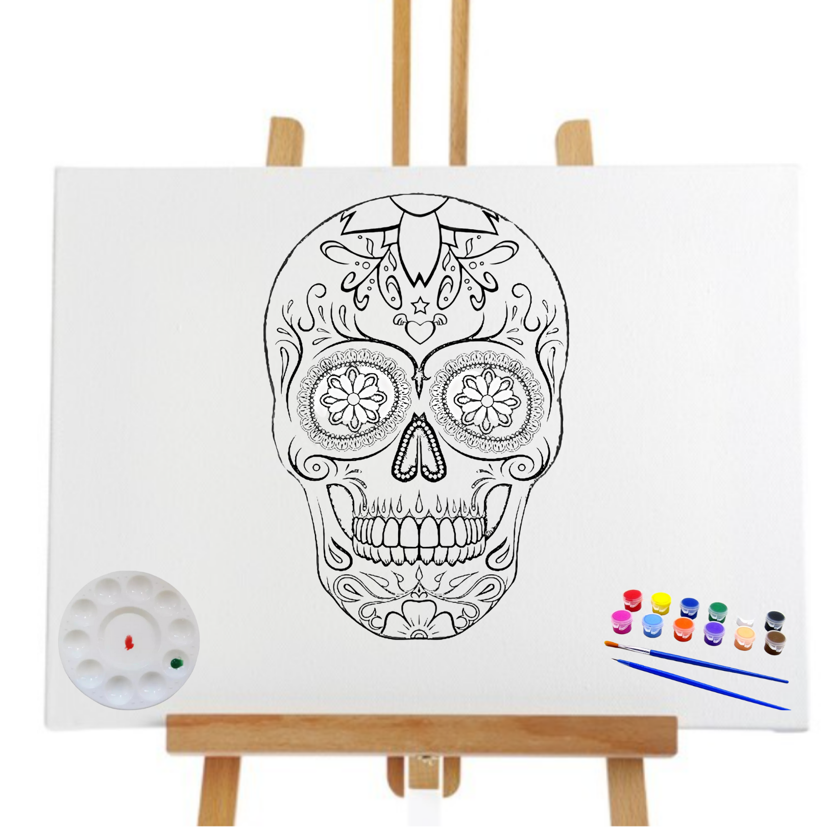 Enjoy the artist in you with a Sip and paint Pre Stretched Pre Drawn Drawn canvas. Great for girls night, family or date night. Canvas is made with the best canvas paper 100% cotton triple primed with acid free archrival quality gesso. Package Includes 8×10 canvas stretched on pine wood with line art design 12 colors of acrylic paint 2 paint brushes The canvas is easy to paint with beautiful line art drawings ready to be filled in for beginners or pro painting artist. Order for the holiday’s with family and enjoy. Black and White Illustration, Line drawing, CanvasPre Drawn Canvas Skull 8X10