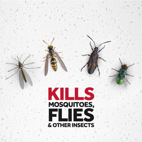 - Kills: Asian Lady Beetles, Boxelder Bugs, Flies, Fruit Flies, Hornets, Mosquitoes, Non-biting Gnats, Small Flying Moths, Wasps, Yellow Jackets