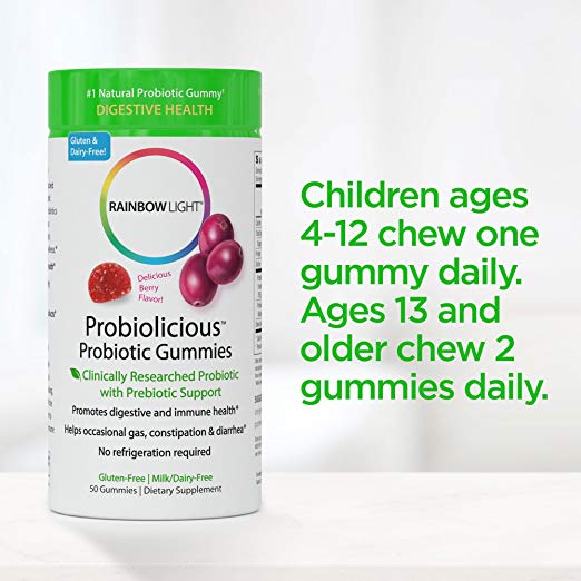 Rainbow Light® Probiolicious? Plus Gummies Plus Superfoods & Probiotics supports a healthy digestive and immune system for overall wellness.. Now Probiolicious? Plus delivers 2 billion CFUs of Bacillus coagulans – a scientifically studied shelf-stable probiotic strain, for an extra dose of digestive support.* These delicious natural berry flavored gummies are shelf-stable with no refrigeration required Plus, this probiotic gummy supports immune and colon health and helps with occasional gas, constipation and bloating.* This formula is vegan and gluten free and contains a rainbow blend of organic superfoods including spirulina, kale, beet, broccoli, carrot and blueberry. Rainbow Light® Probiolicious? Plus Gummies make it easy to support a healthy digestive and immune system.