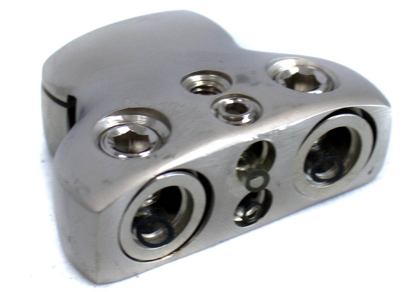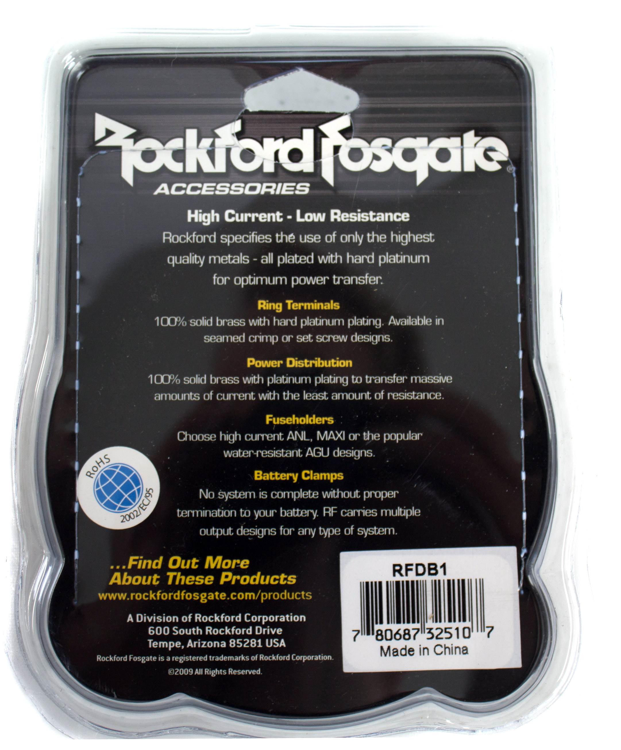The ROCKFORD FOSGATE **RFDB1** is a quality made 1/0 or 4-Gauge Positive-Negative Car Audio Battery Terminal features Platinum plated battery terminals allowing for both a positive or negative connection utilizing the supplied sizing ring. The terminals of the **RFDB1** allow for multiple wire size inputs. Positive/Negative battery terminal, platinum finish. (2) 1/0 AWG/4 AWG input (2) 8 AWG inputs. The Rockford Fosgate cables exceeds American wire gauge standards. We are an authorized ROCKFORD FOSGATE dealer!