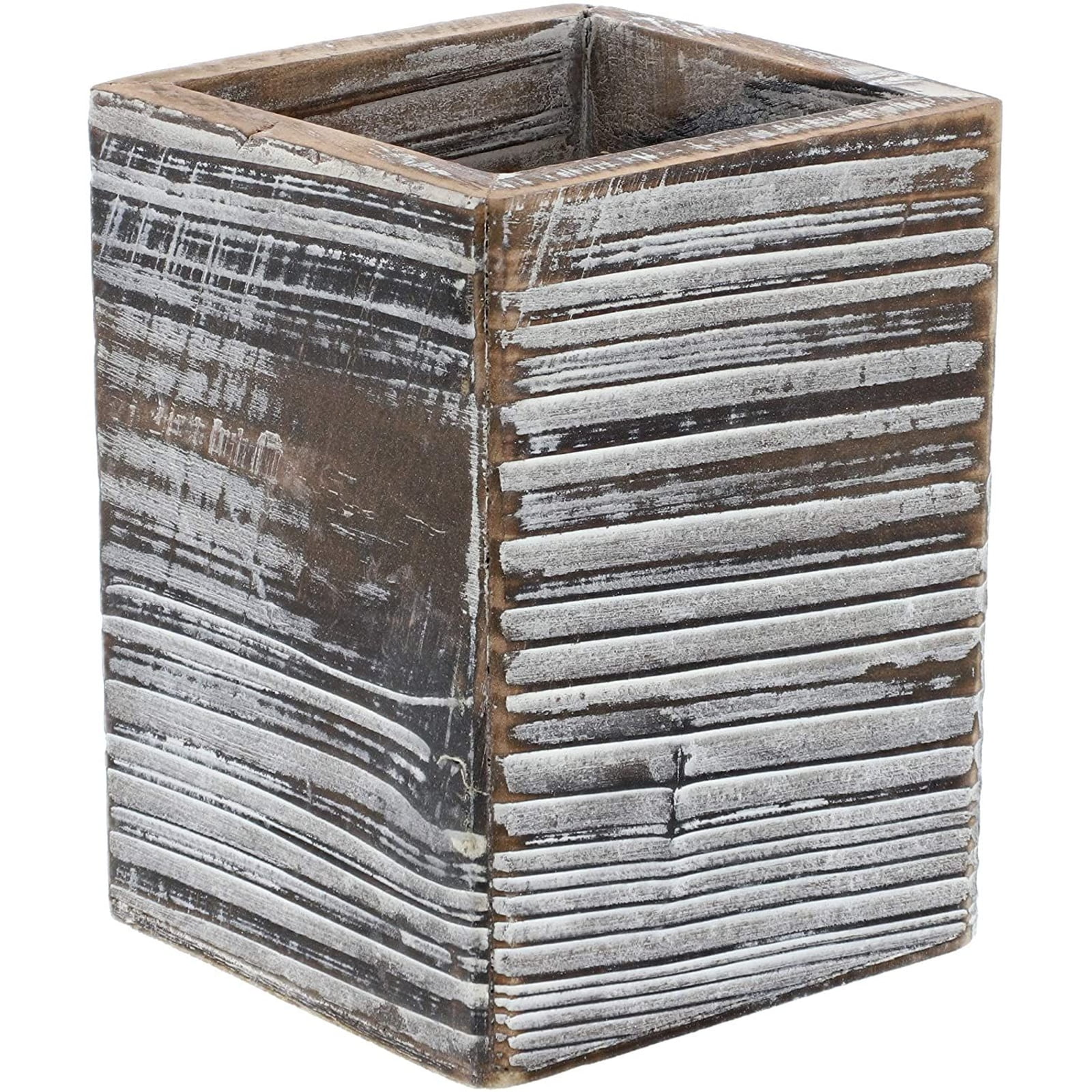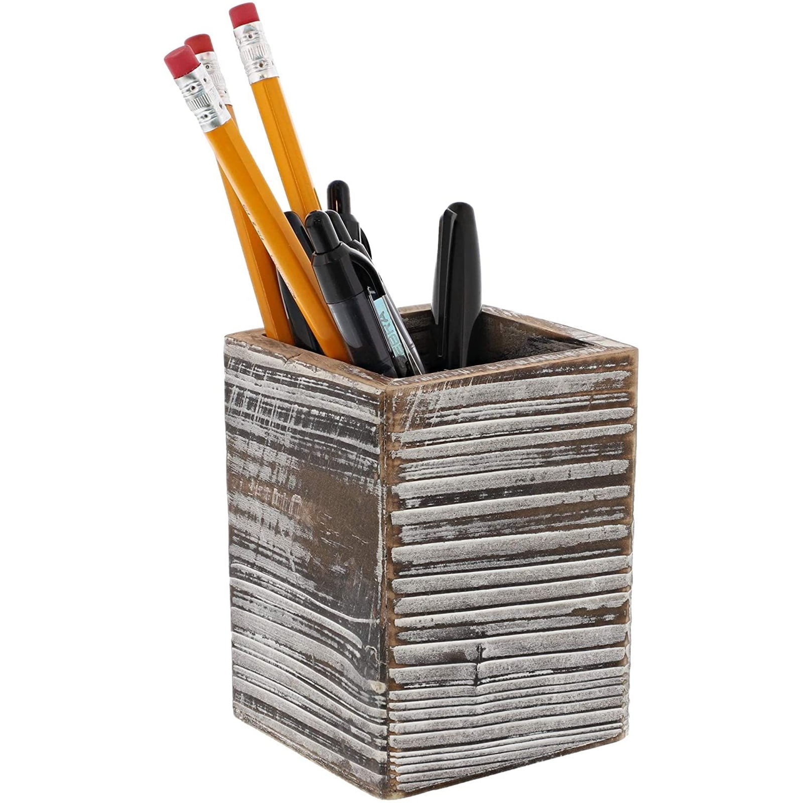 2 Pack wooden pencil holders featuring a rustic and weathered design. Perfect for desktop, home, and office use. Keep your office supplies, pens, pencils, scissors, and rulers neat and tid. L3 x W3 x H4 inches.