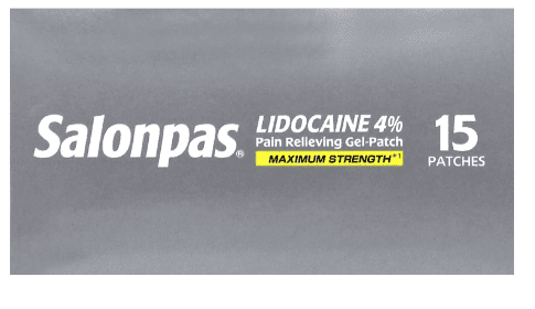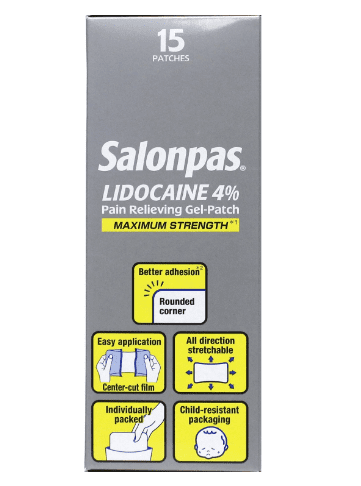 Introducing Salonpas® Lidocaine Pain Relieving Gel-Patch. Salonpas® Lidocaine Pain Relieving Gel- Patch provides temporary relief of pain associated with back, neck, shoulders, knees and elbows. Salonpas® Lidocaine Pain Relieving Gel-Patch is not indicated for post-herpetic neuralgia.