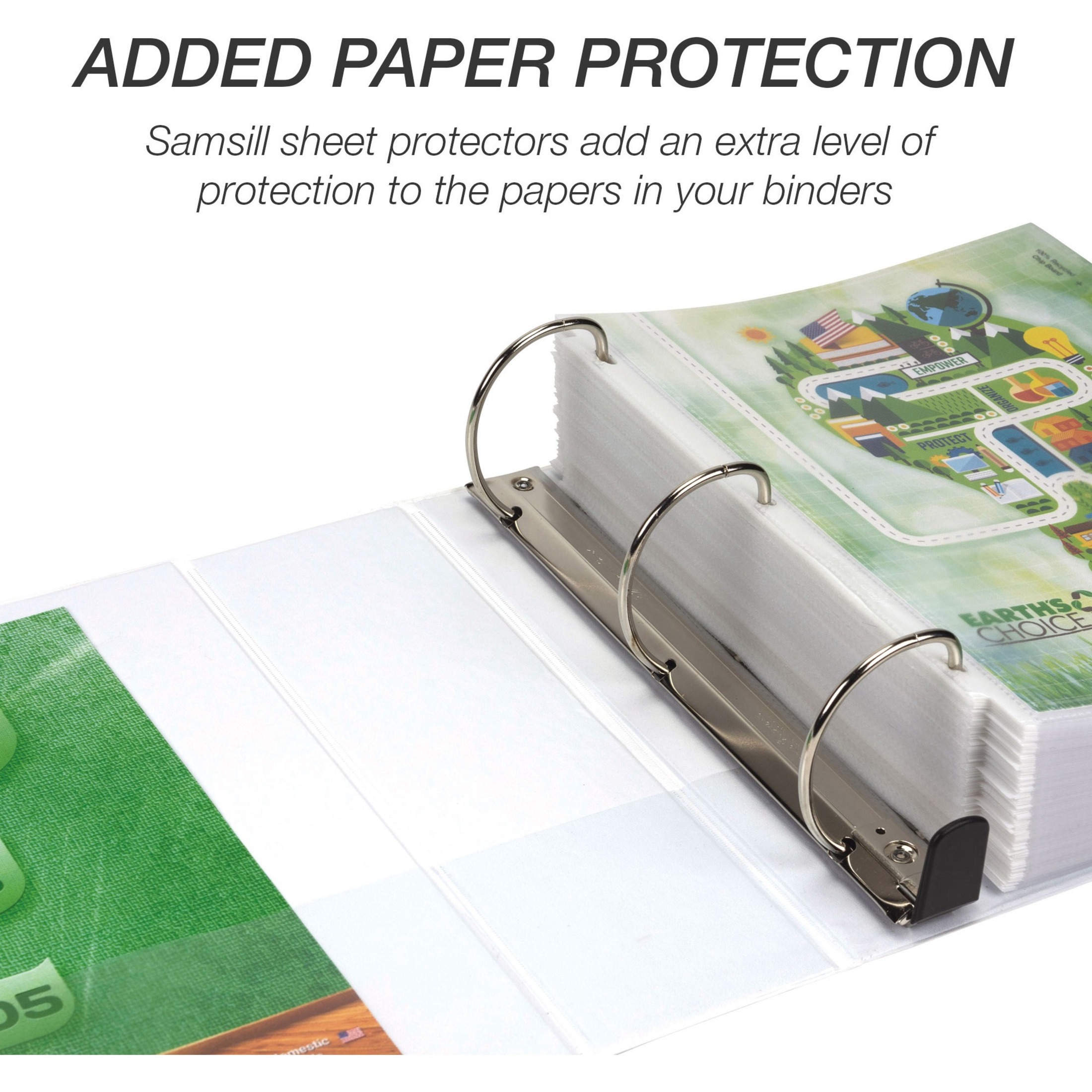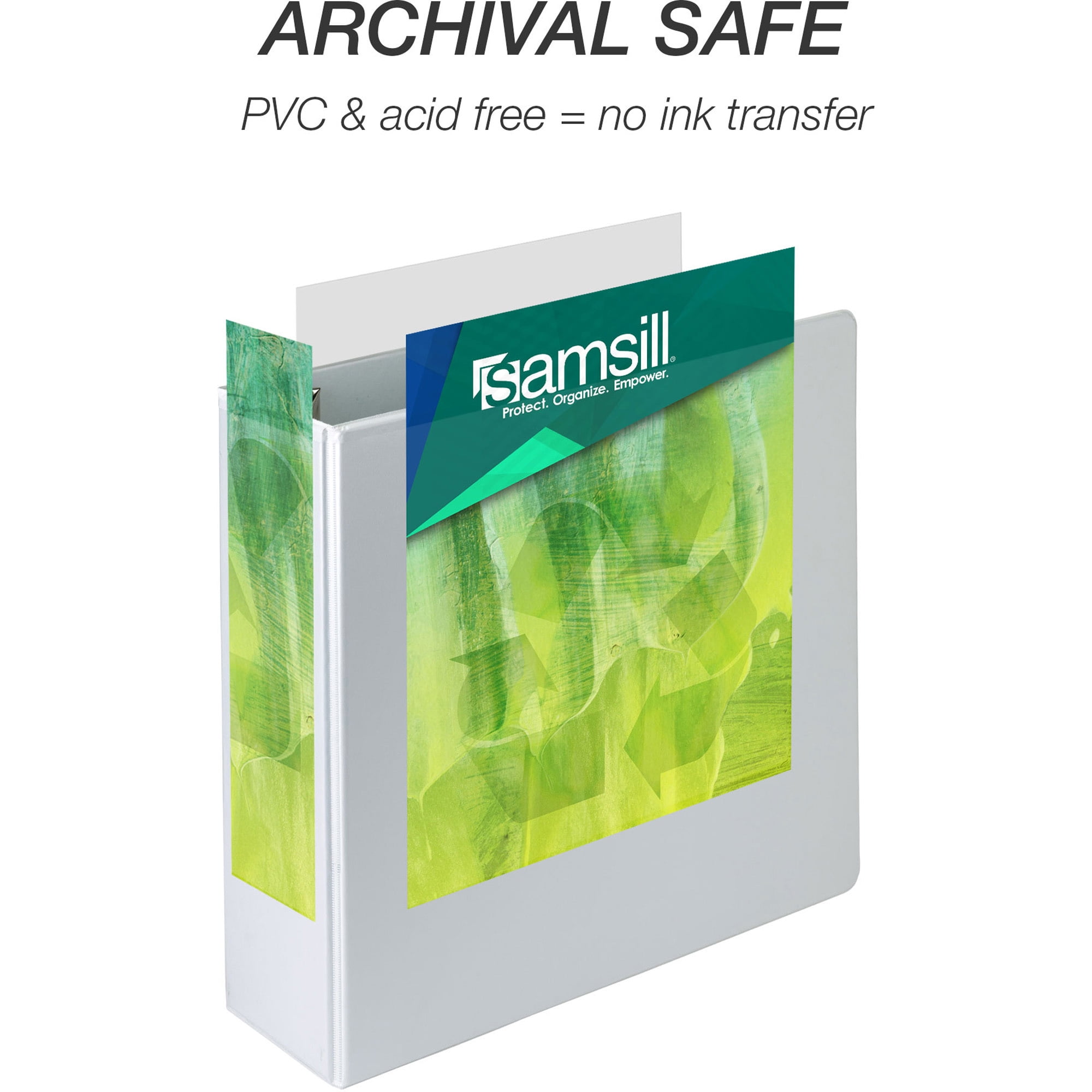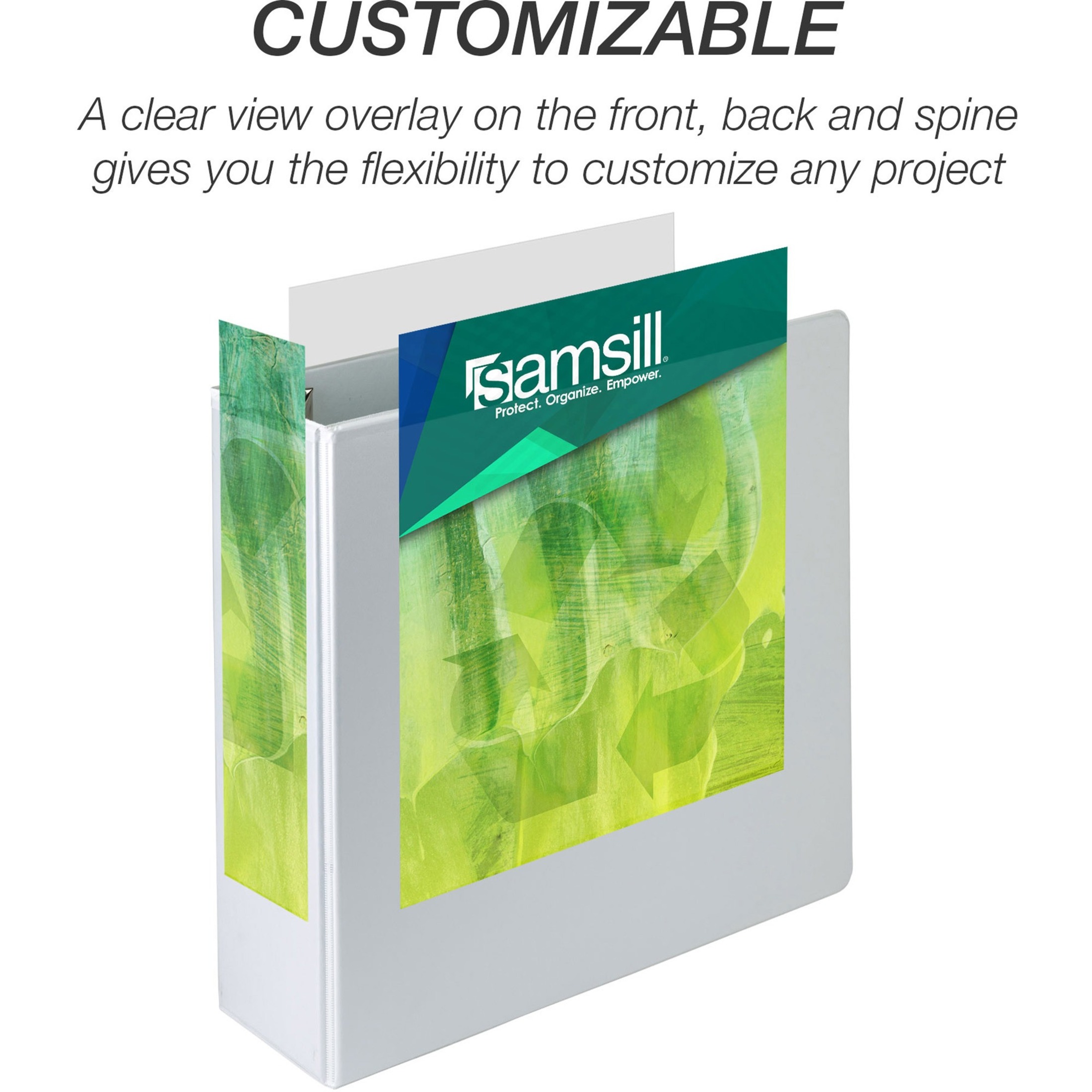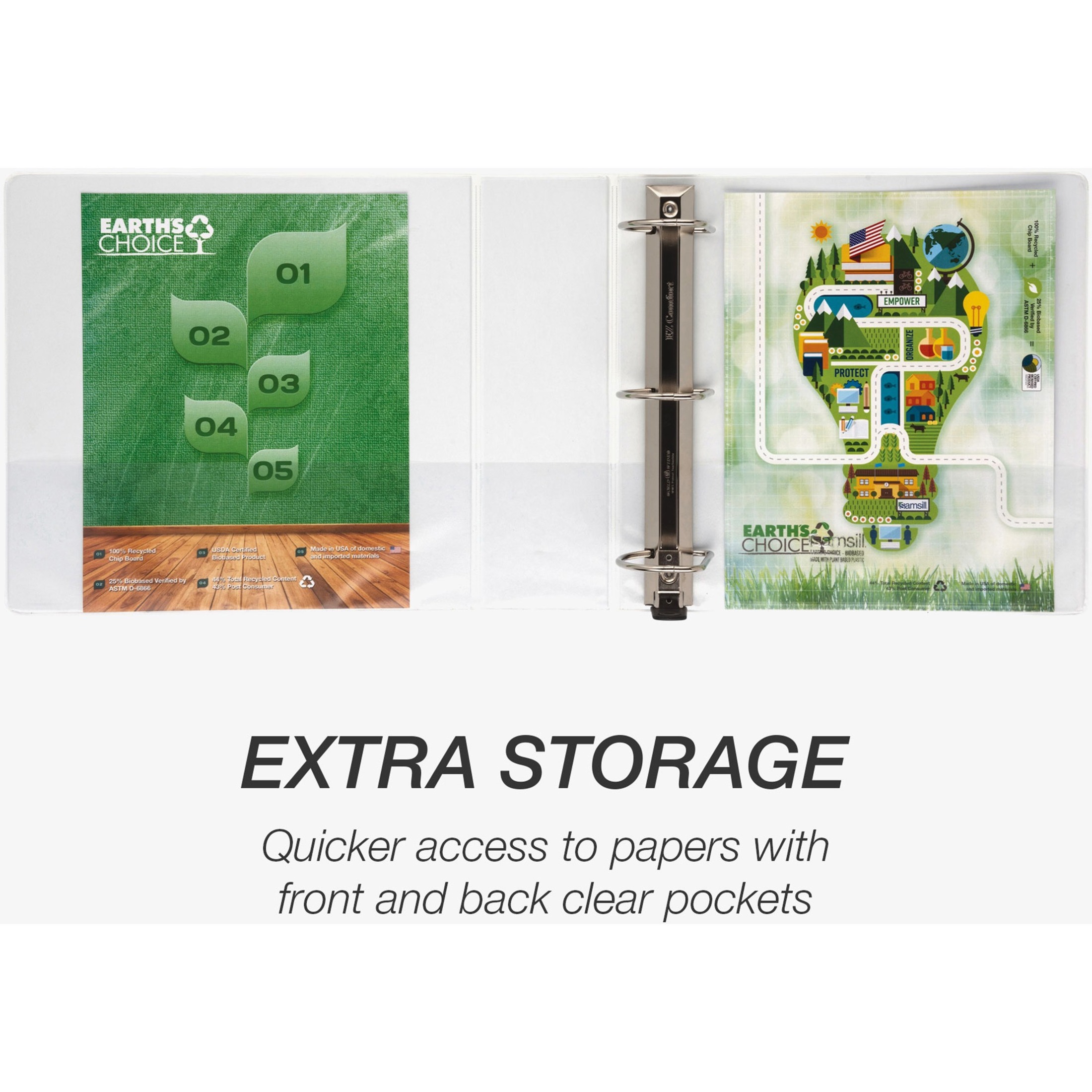 Biobased, three-ring, view binder features a durable, well-constructed design with both biobased and recycled properties to make it a great sustainability solution for the environment. It is made with renewable plastic. Biobased content is carefully tested using ASTM D-6866 standards. The 4" capacity of the One-Touch rings can comfortably hold up to 775 sheets of three-hole punched, letter-size paper. Binder includes two clear inside pockets on the front and back covers for additional storage and organization of loose documents and unpunched papers. A clear overlay on the front, back and spine of the binder gives full control and flexibility over customization of presentations, organizational projects, office reports, class projects and more.