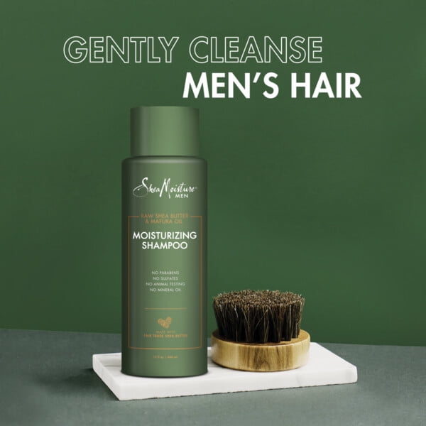 - Pour a large coin-sized amount of Moisturizing Shampoo. Massage into the hair and scalp to work into a lather. Rinse shampoo thoroughly and finish with SheaMoisture Men Conditioner.