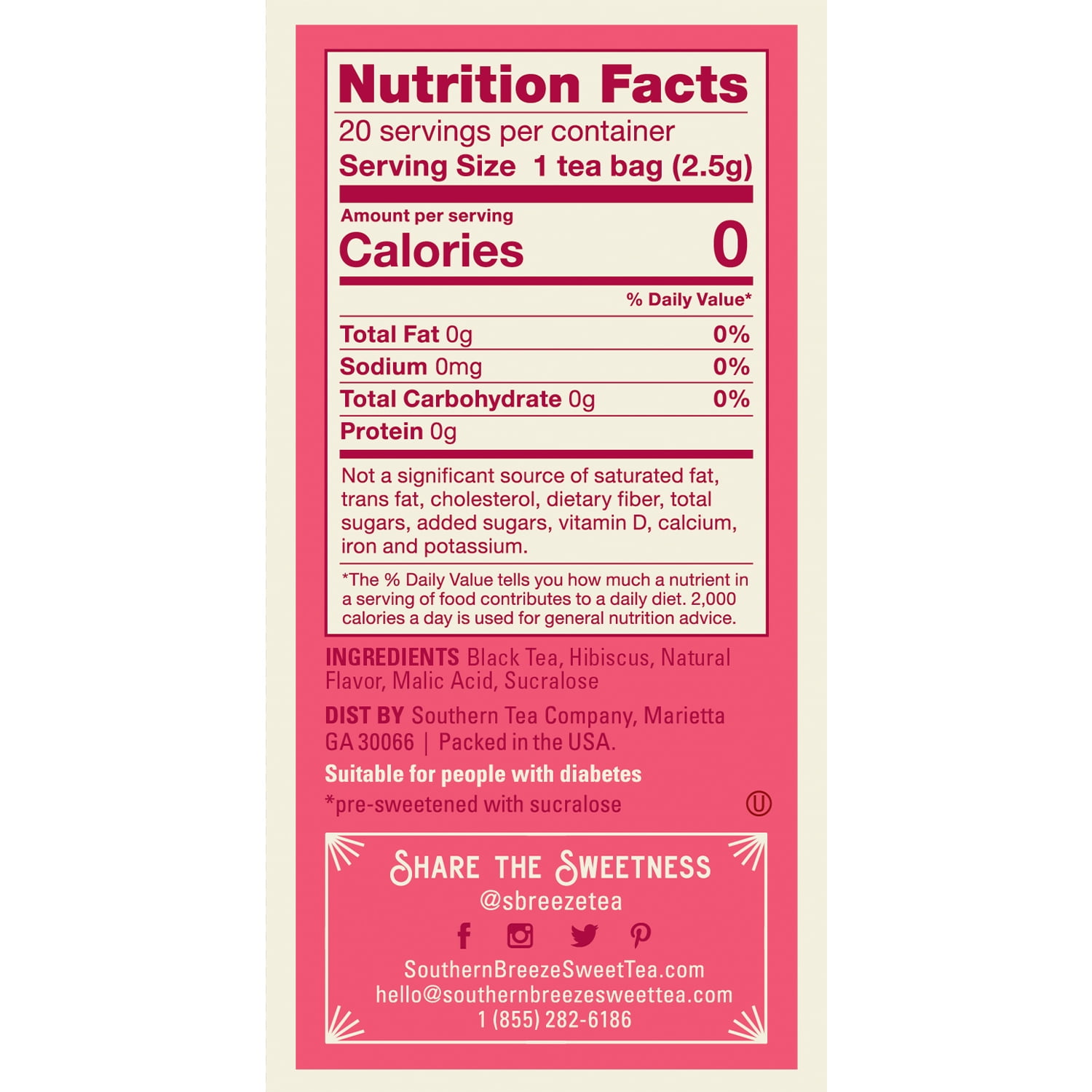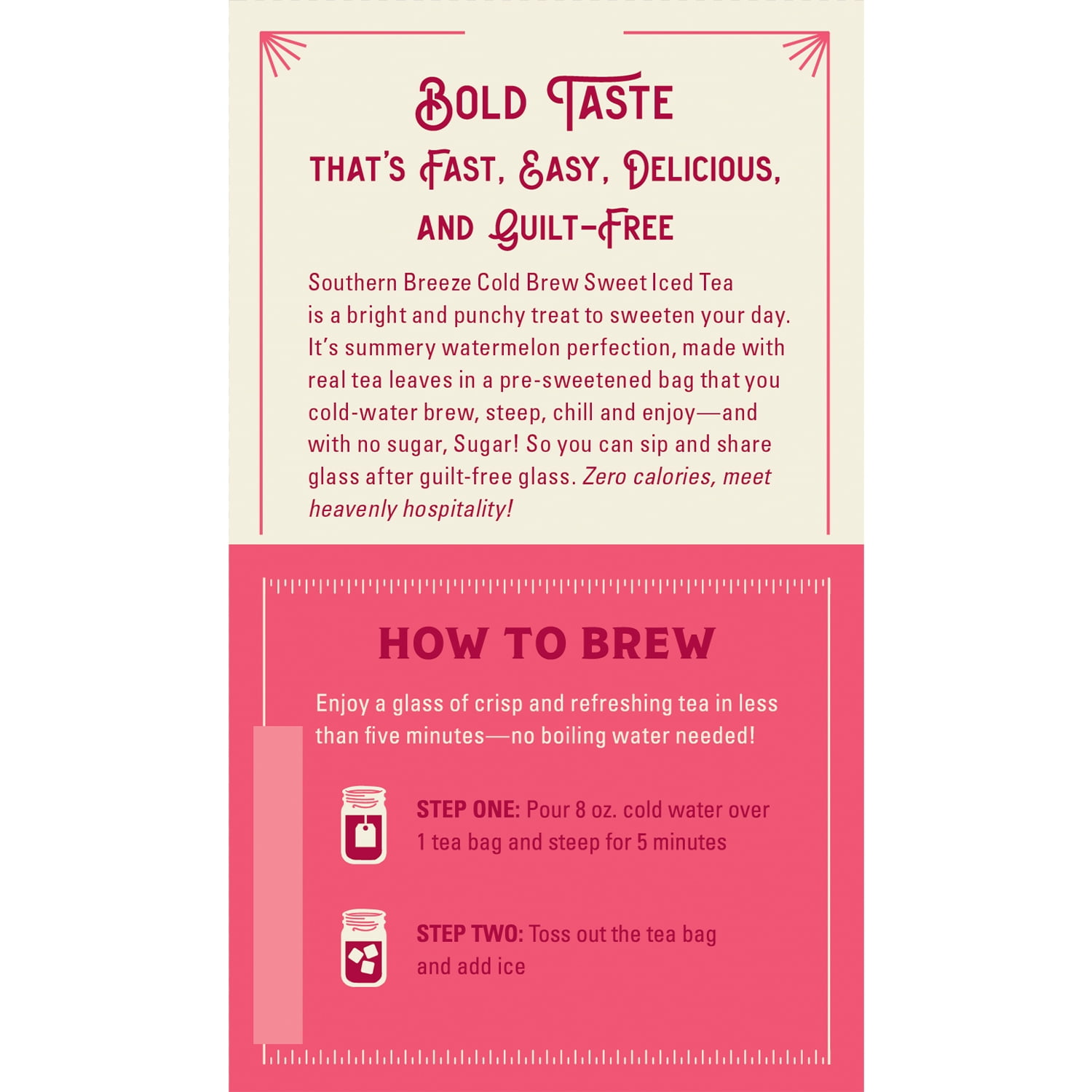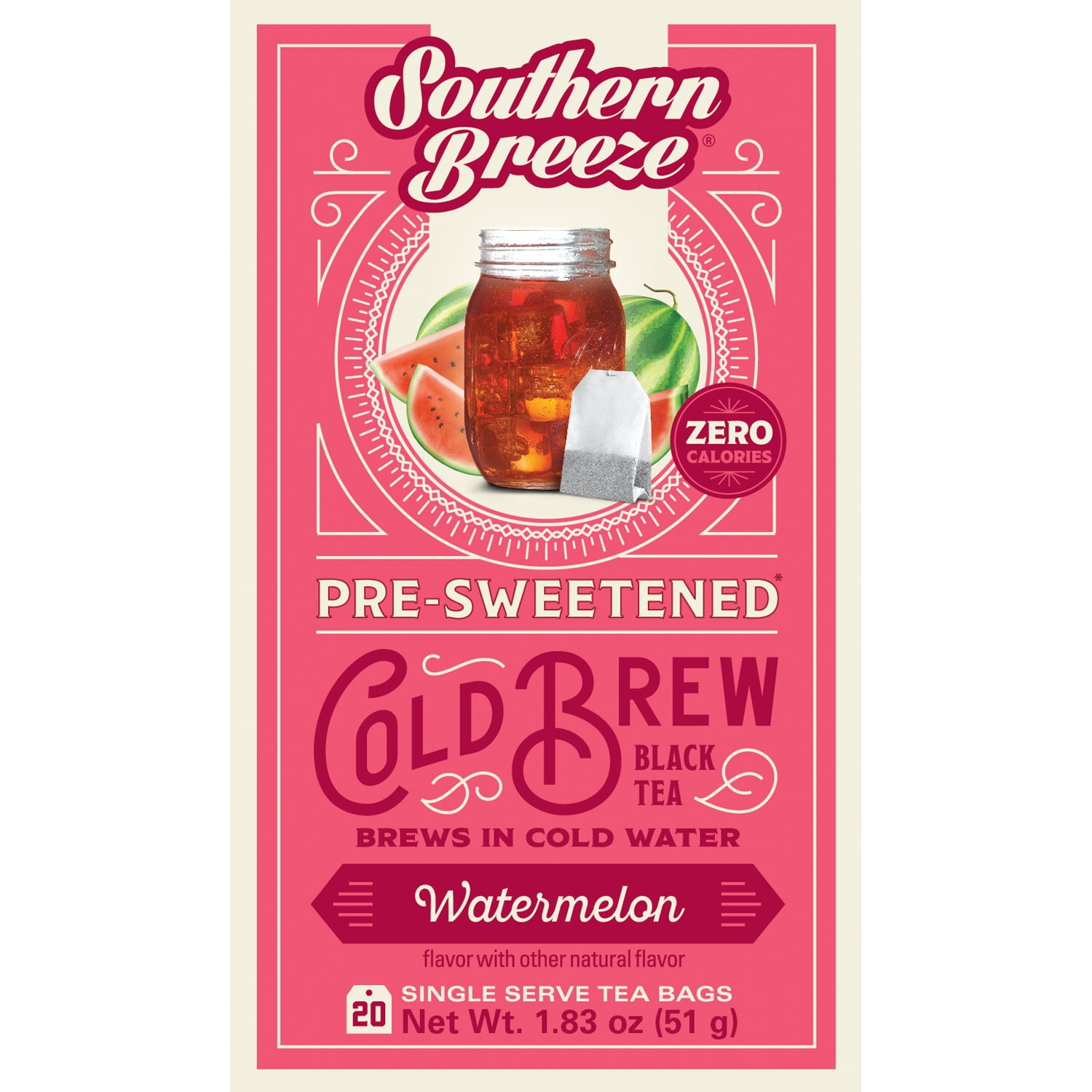 Southern Breeze Watermelon Cold Brew Sweet Iced Tea is a bright and punchy treat to sweeten your day. It’s summery watermelon perfection, made with real tea leaves in a pre-sweetened bag that you cold-water brew, steep, chill and enjoy—and with no sugar, Sugar! So you can sip and share glass after guilt-free glass. Zero calories, meet heavenly hospitality!