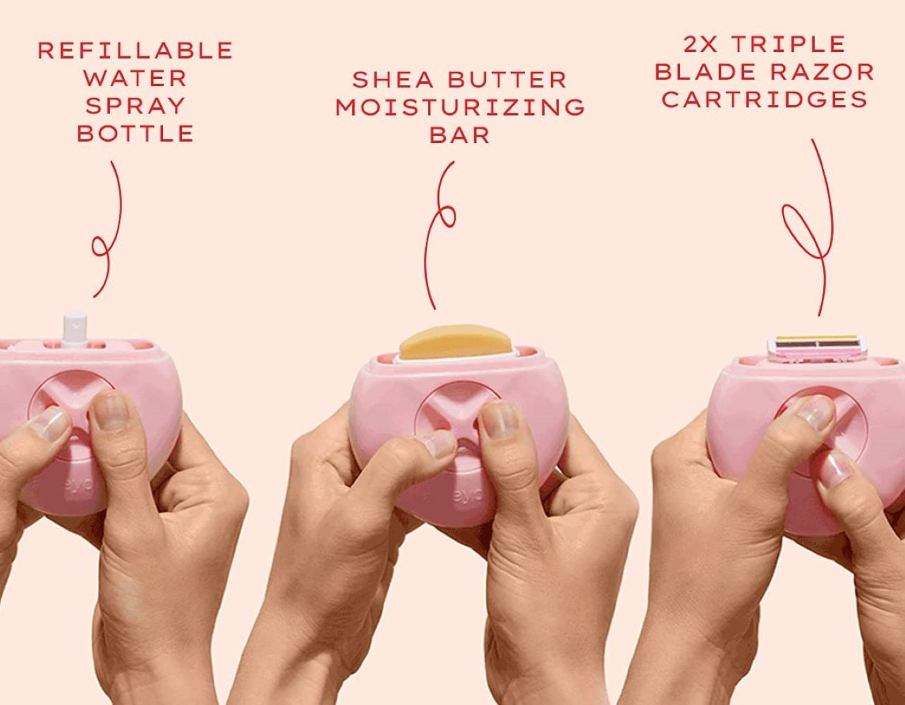- Refillable components include a water spray bottle, a Shea Butter moisturizing bar, and two triple-blade razor cartridges.