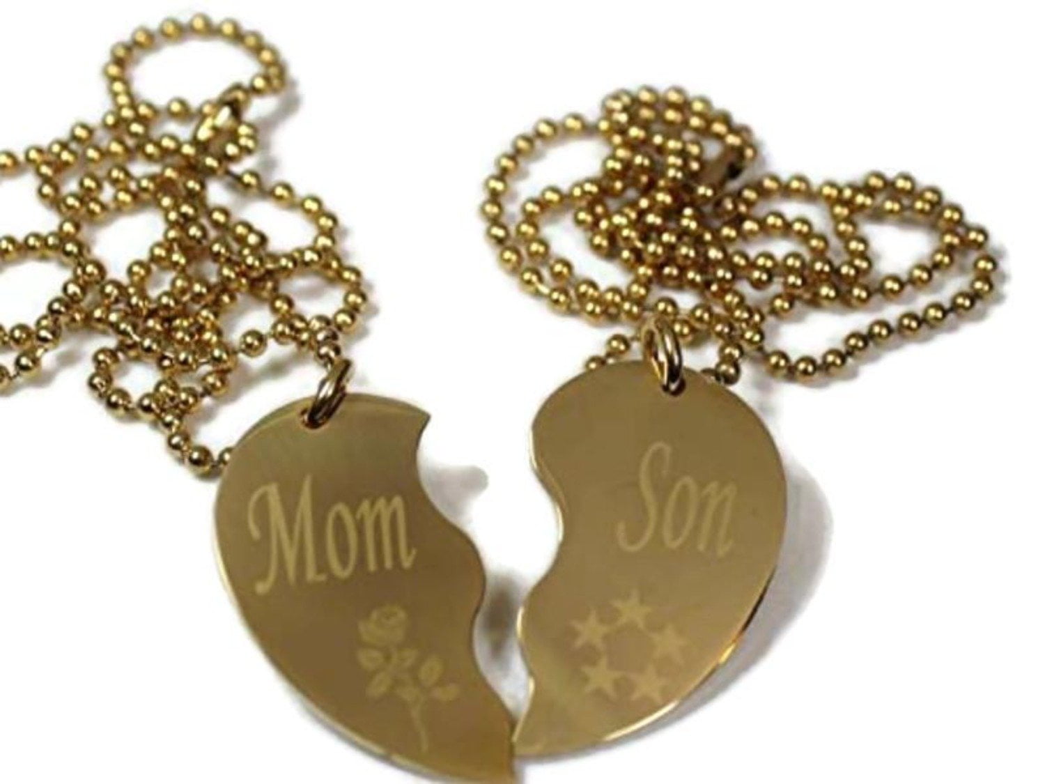 AWESOME, BEAUTIFUL MOM SON, STARS IMAGE SPLIT HEART STAINLESS STEEL,IPG GOLD PLATED!! OUTSTANDING QUALITY, 3.2MM BALL CHAIN, STAINLESS STEEL IPG GOLD, NICE SIZE