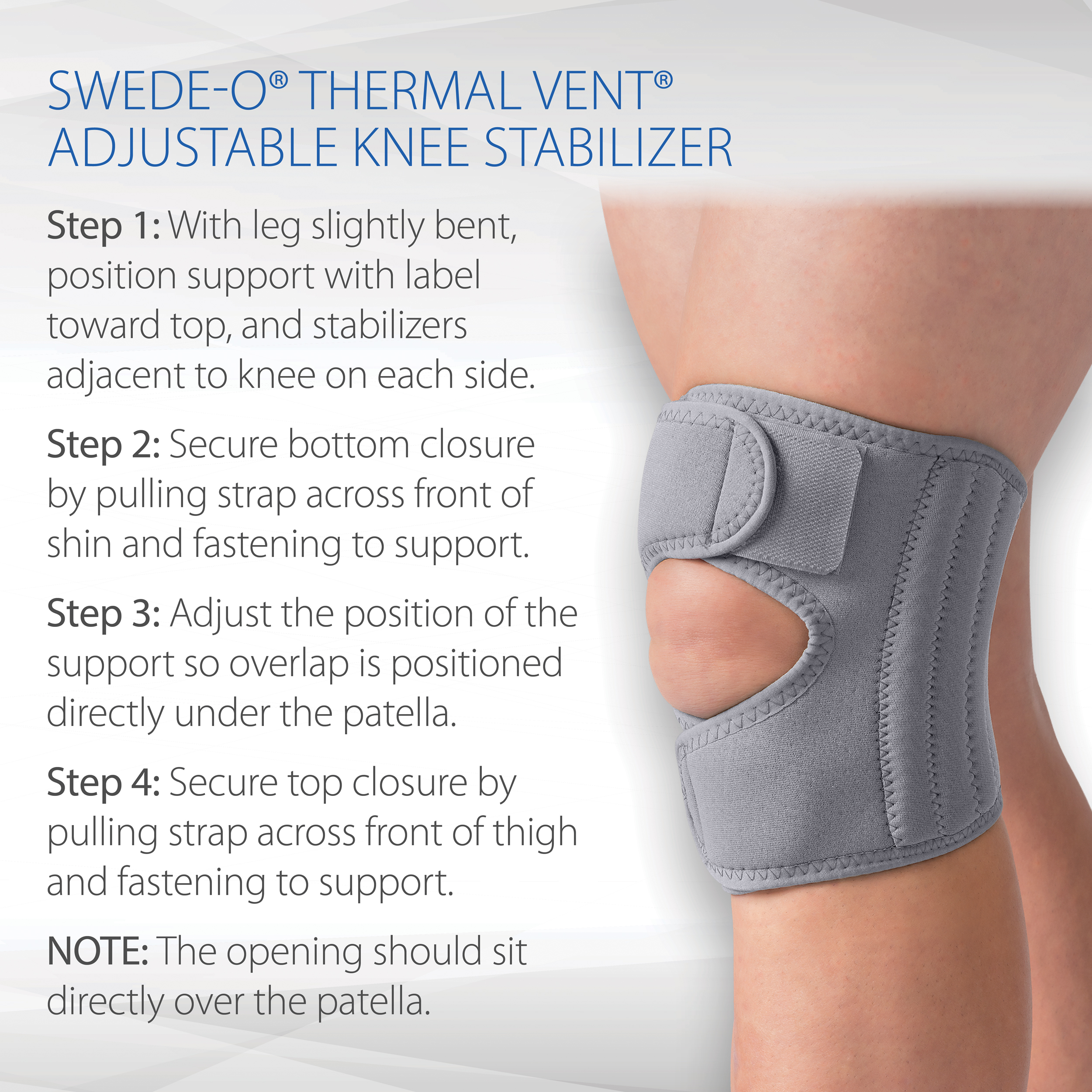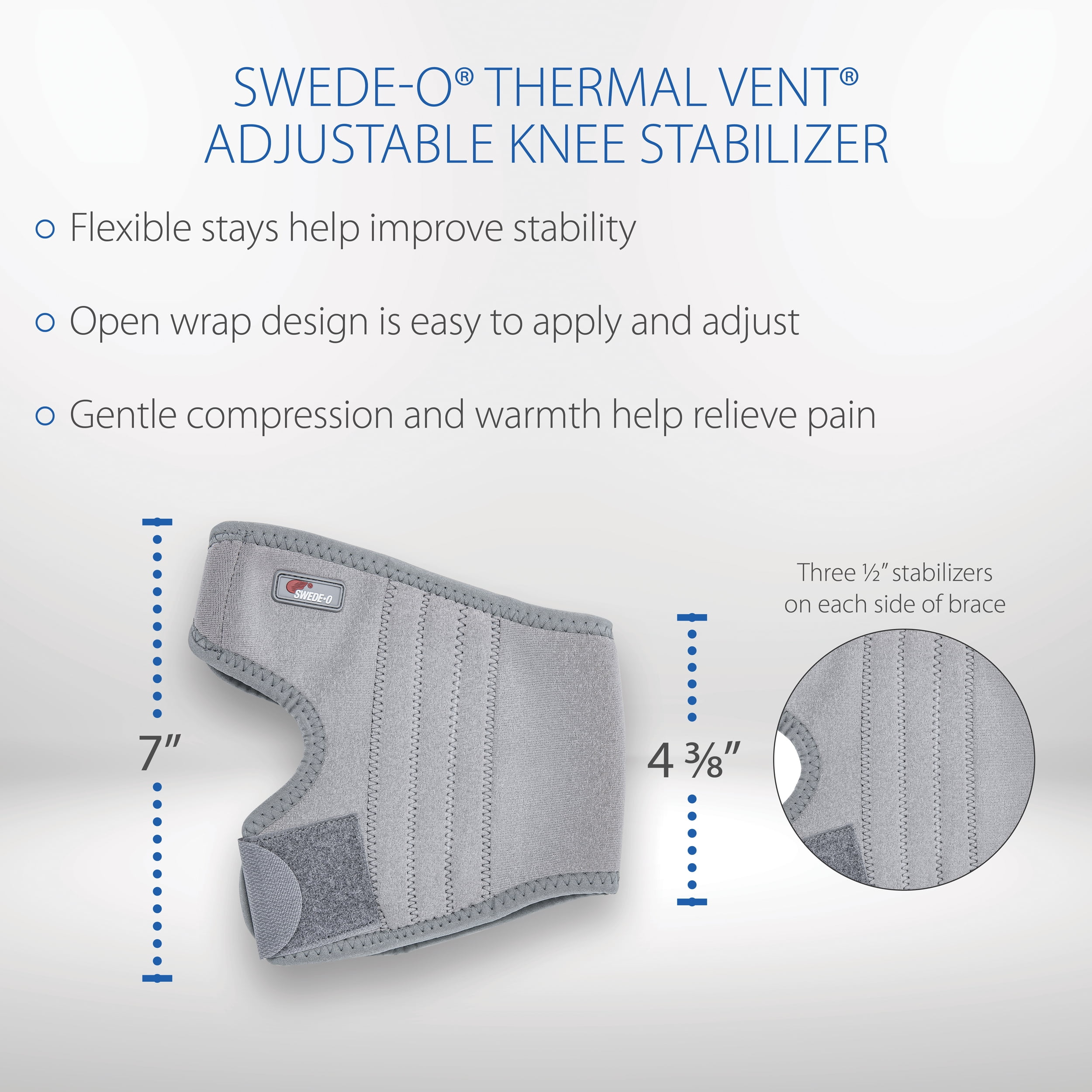 The low-profile Swede-O Gray Thermal Vent Adjustable Knee Stabilizer Brace is designed to support weakened knees and help relieve aches, pain, strains, sprains. The integrated flexible stays provide medial and lateral knee support. Comfortable support, gentle compression, and heat therapy help relieve knee pain and promote healing. The front opening does not cause pressure across the patella which helps prevent aggravation to injuries and helps reduce tenderness and bruising. The material is soft and comfortable against the skin. The bilateral design fits the right or left knee. Available in Small/Medium and Large/XLarge