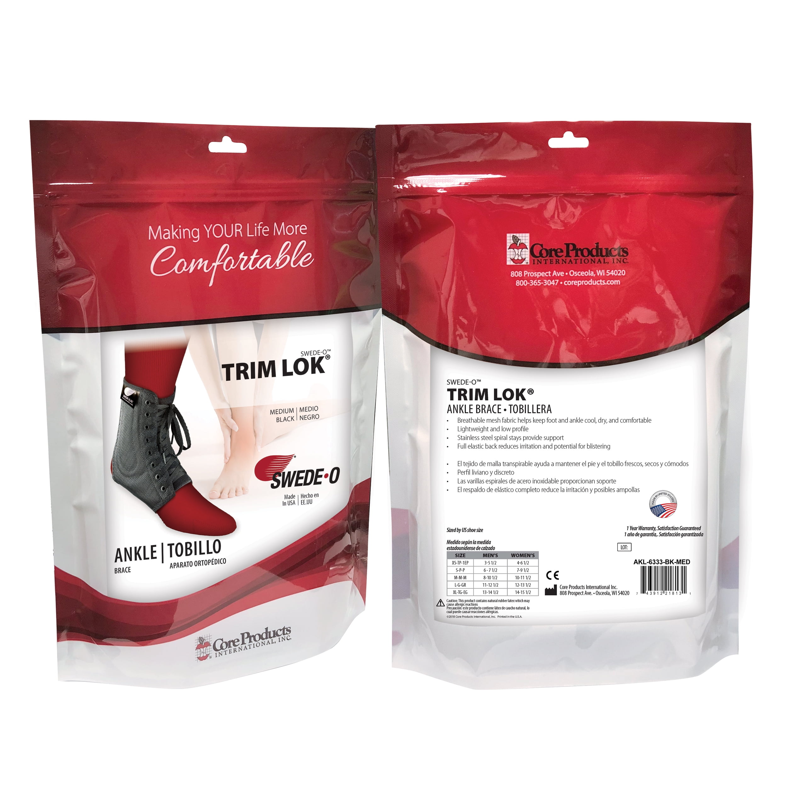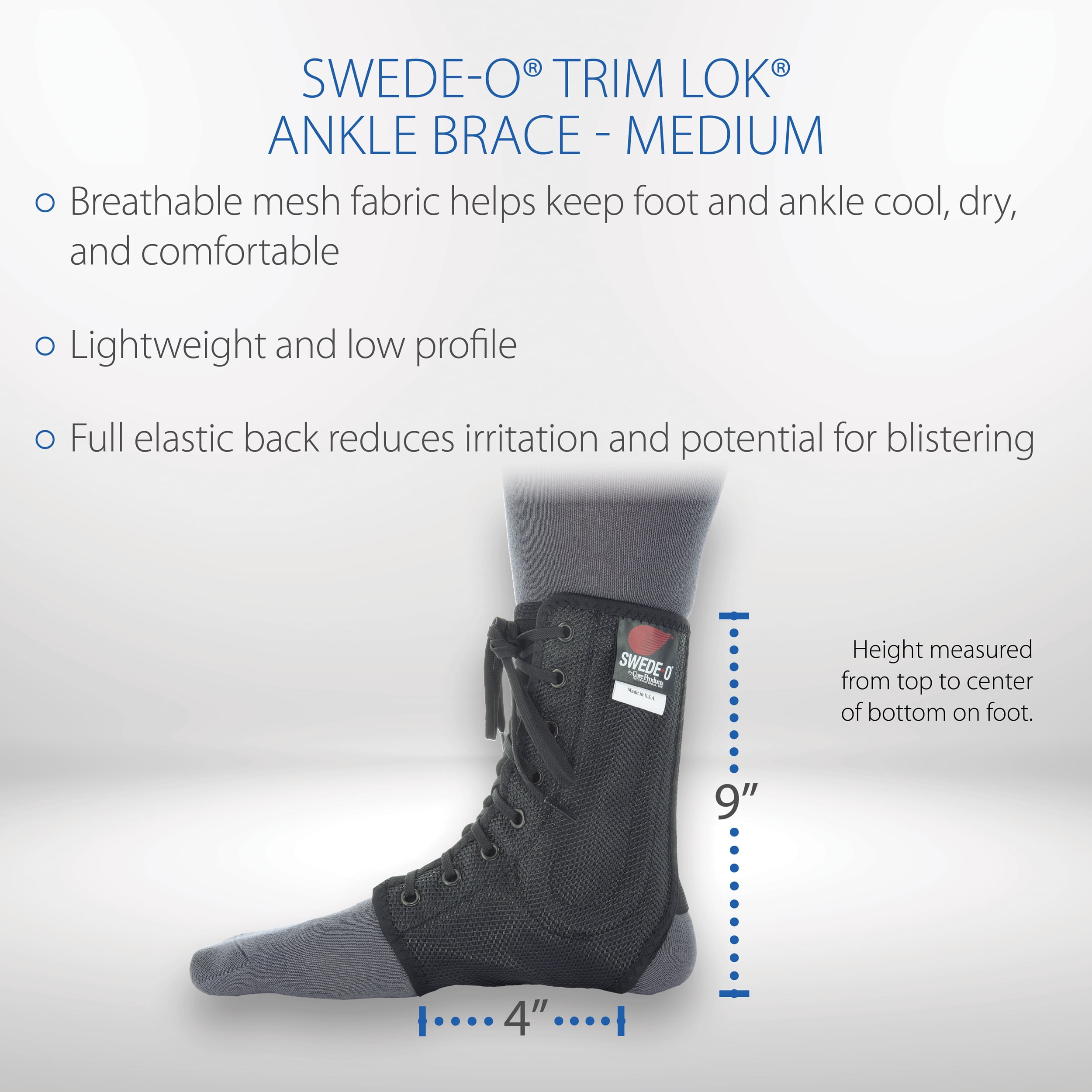 The Swede-O Trim Lok Brace is 25 percent lighter than other standard ankle braces. This brace is made from a nylon mesh material to provide airflow, which helps to keep the foot and ankle cool, dry, and comfortable. The built-in stainless steel spiral stays provide support to help prevent the ankle from rolling. The lightweight, low profile design fits comfortably in most shoes. A full elastic back is comfortable against the Achilles tendon and helps reduce irritation and potential for blistering. Backed by an industry leading 1-year warranty. Made in the USA. Available in Black- XSmall, Small, Medium, Large and XLarge.