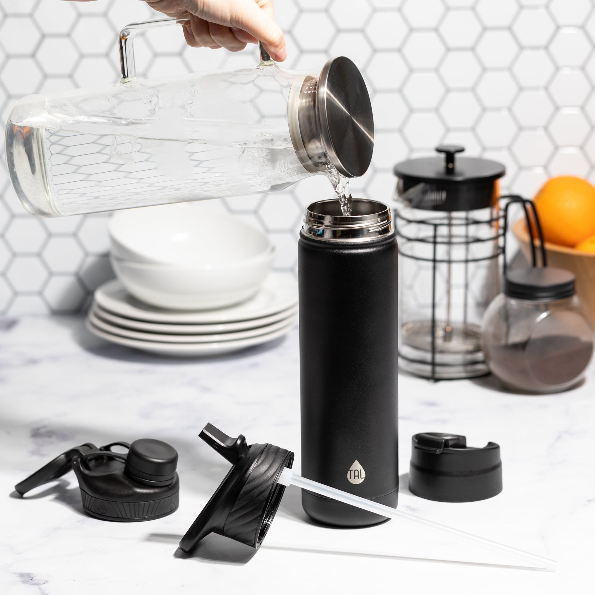 Tal Stainless Steel Ranger Tumbler 26 fl oz, Black, 5-Piece Set includes a Ranger Pro tumbler, Straw, Coffee Lid, Flip Lid, and a Pro Lid. The stainless steel tumbler keeps drinks hot or cold for hours! Great for on-the-go and fits most cupholders.