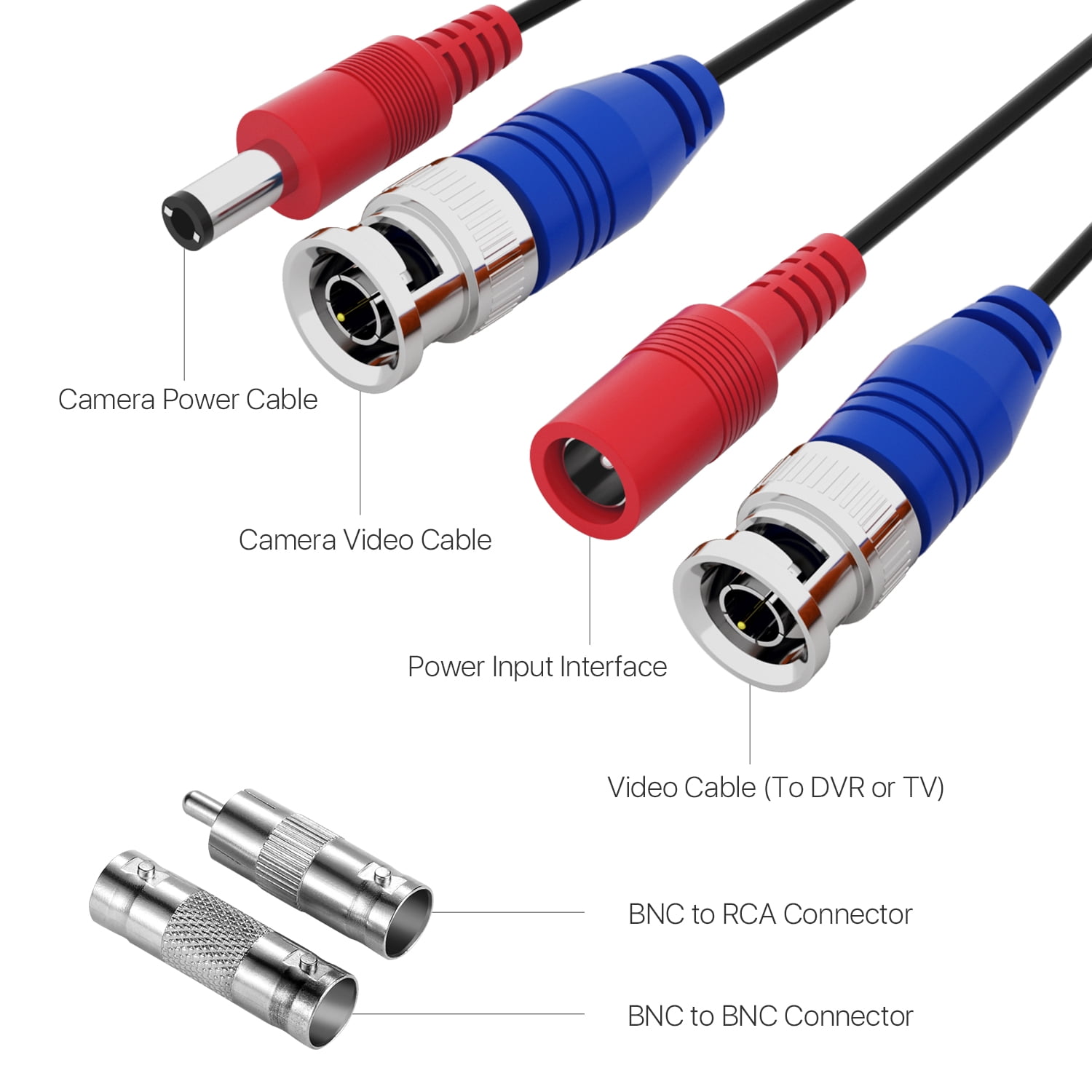 It comes with two types of connectors for use with the security cameras, DVRs or any standard Surveillance equipment.
