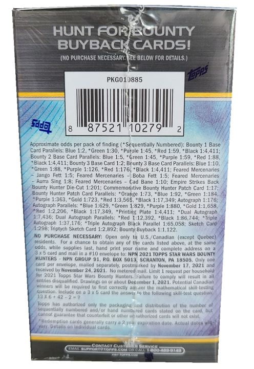 Topps presents the 2021 Star Wars Bounty Hunters blaster box! This box includes 10 packs with 6 cards per pack! Each box contains one commemorative Bounty Hunter Patch card or Sketch card!