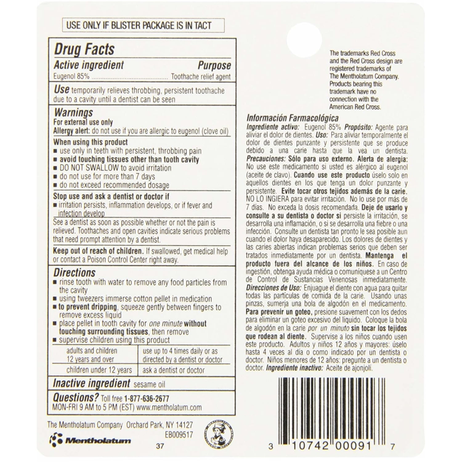 - The complete pack for toothache pain. Fast pain relief! This package includes: Toothache medication; Cotton pellets; Metal tweezers. The name Red Cross and the Red Cross design are trademarks of The Mentholatum Co., Inc. Products bearing this trademark have no connection with the American Red Cross. Made in USA.
