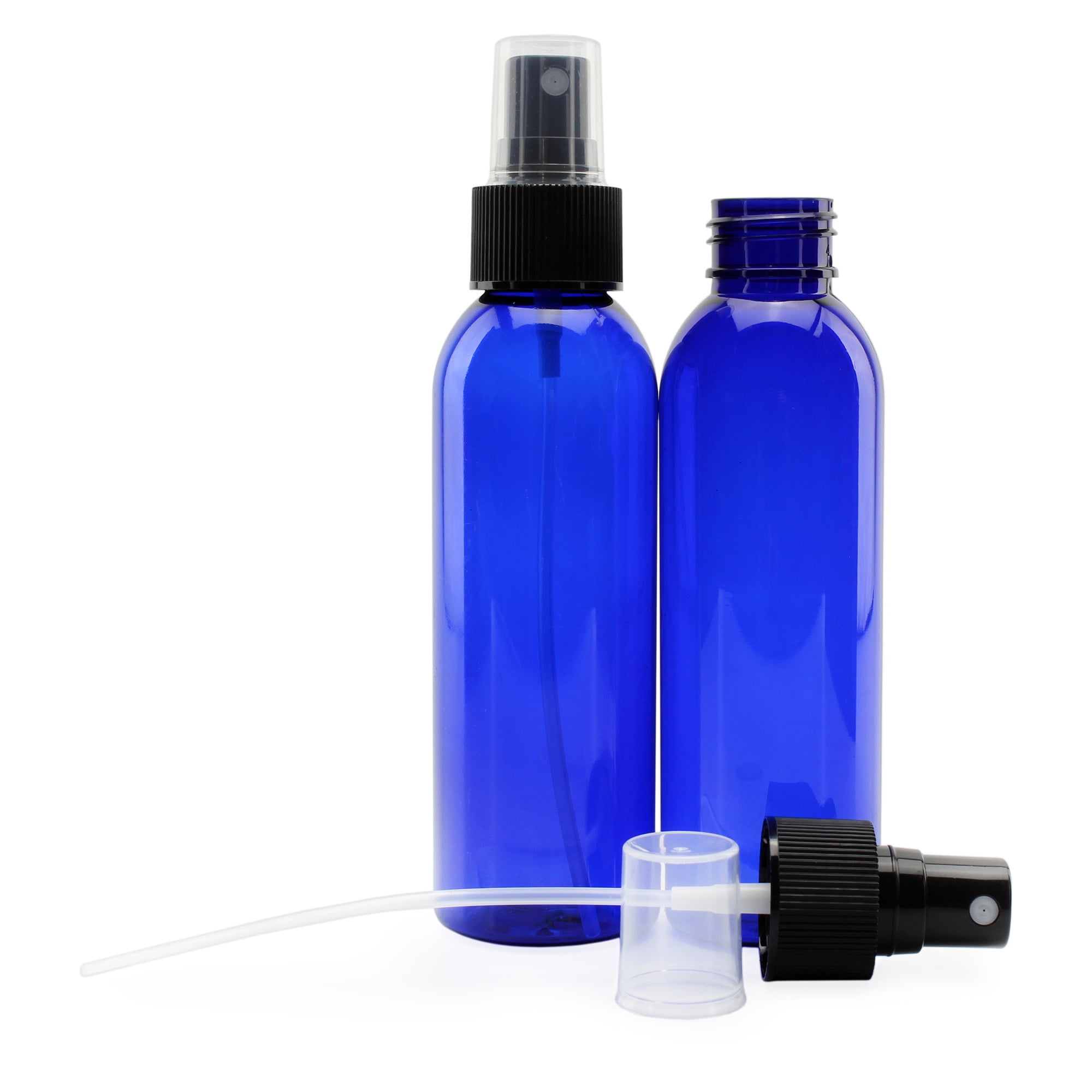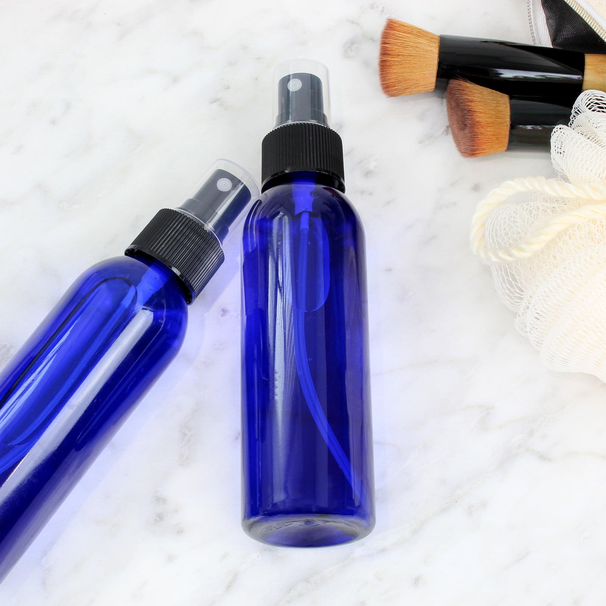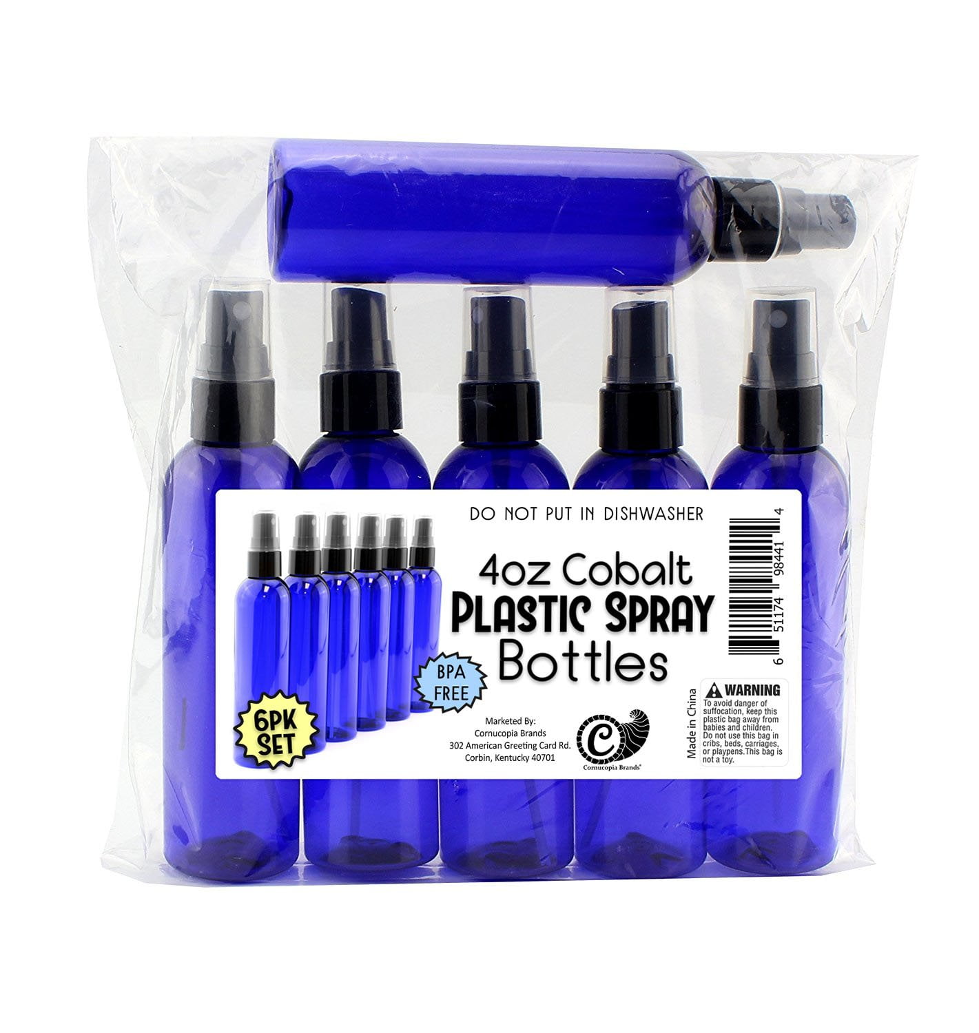 Cornucopia Brands 4oz Cobalt Blue PLASTIC PET Spray Bottles with Fine Mist Atomizer Caps (6-pack bundle, slimline style); for DIY Home Cleaning, Travel-Size, Gift Size, & Sample Size Aromatherapy & Beauty Care