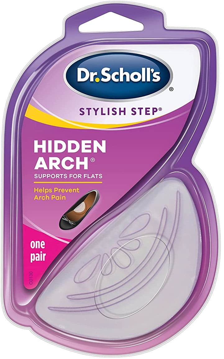 Dr. Scholl’s Stylish Step Hidden Arch Support for flats, 1 pair per pack. These are designed specifically for women who experienced pain in the arches of their feet as a result of wearing flats. They prevent arch pain in flats and the soft gel comfortably supports the arch while staying firmly in place and won’t crowd feet in shoes.