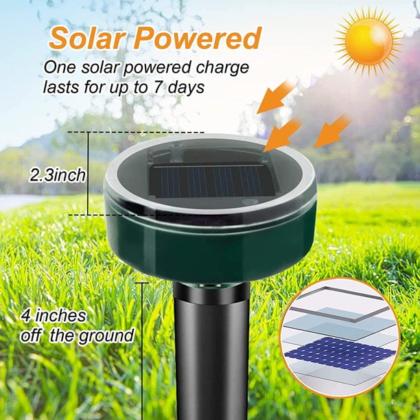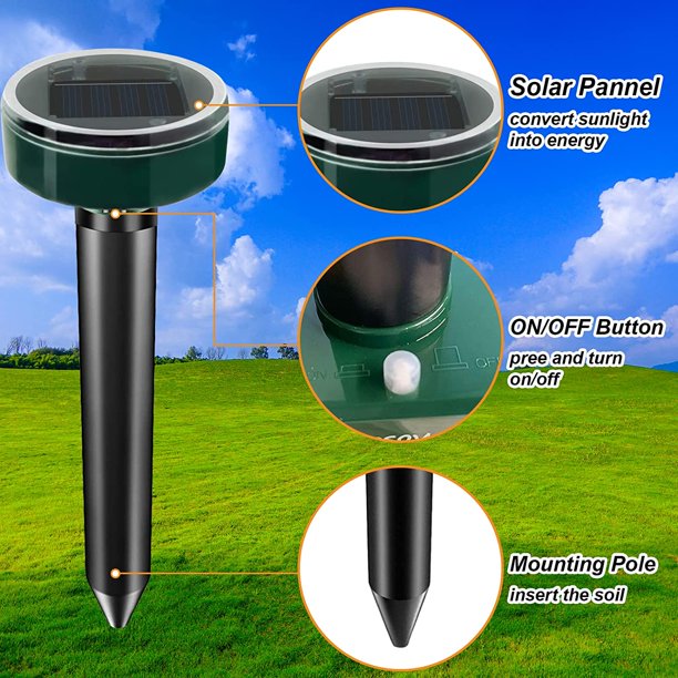- 【Easy to Use, no Installation Needed】 Pick a location free from shade and cover, then dig a hole in the ground to place the device. Insert the stake (bar) into the ground, make sure the top is above to the surface roughly 1 or 2 inches. Place soil around the unit, securing it in the earth. Then slide the power button “ON/OFF” to the position of “ON”, it will start working.