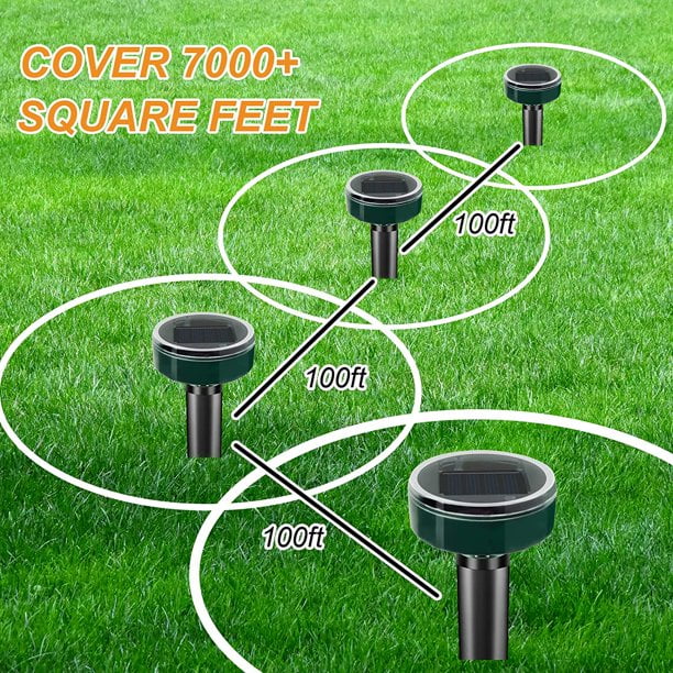 - 【Effective Gopher Repellent】 Its effective range is up to 4,000 sq. ft. For best results, place one solar mole repeller every 100 feet in affected areas. It must be used continuously for 7-14 days before ground rodents start to move away from the area. Please keep using our mole repellent for 2-4 weeks at least to repel the mole from your yard, lawn, or garden.