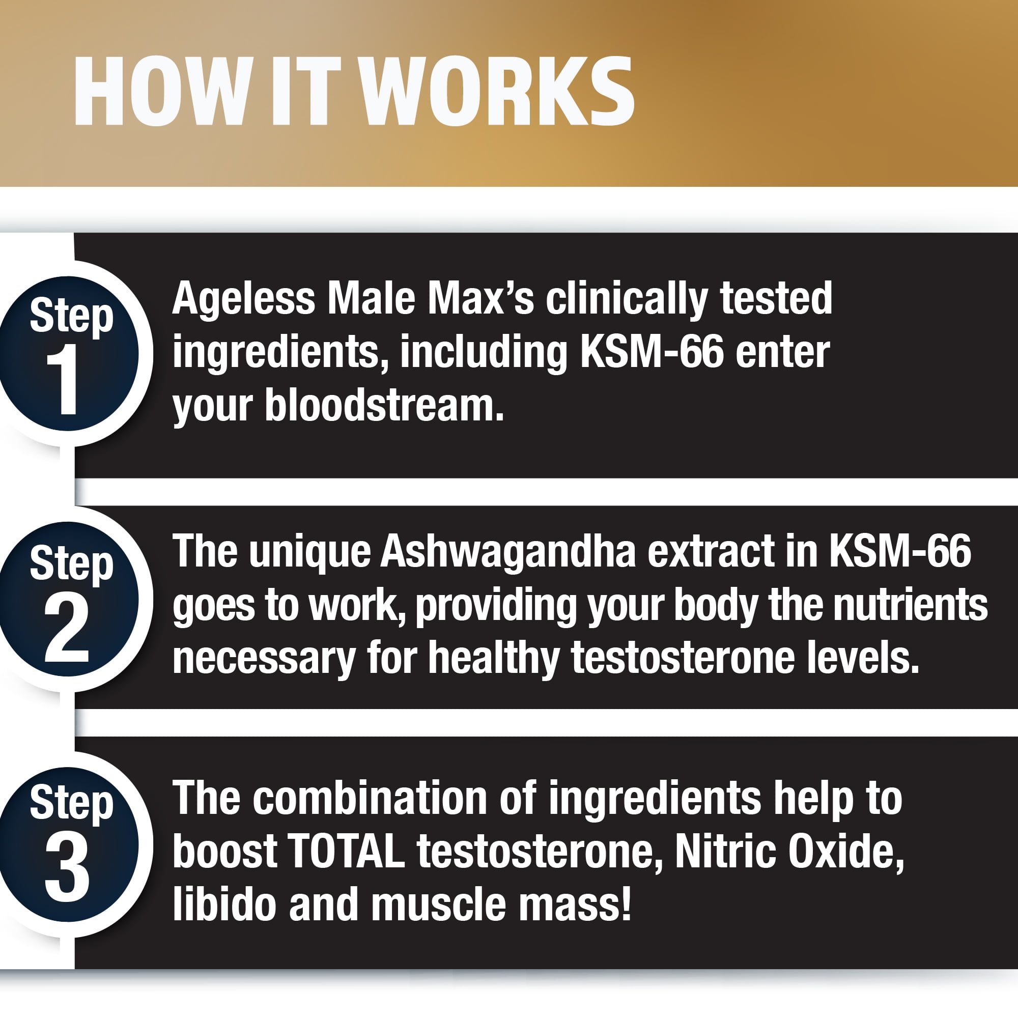 - BOOST TOTAL TESTOSTERONE: Let’s cut to the point. Many testosterone booster supplements out there can only boost what’s called “free testosterone”. Increasing your free testosterone is good, but that only makes up for roughly 3% of your total T level. Ageless Male Max has an ingredient called KSM-66, shown in a clinical study to boost TOTAL testosterone