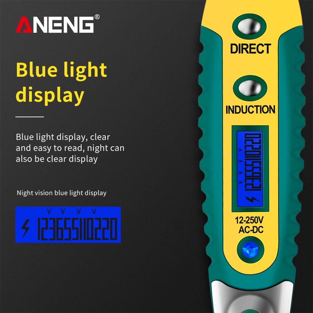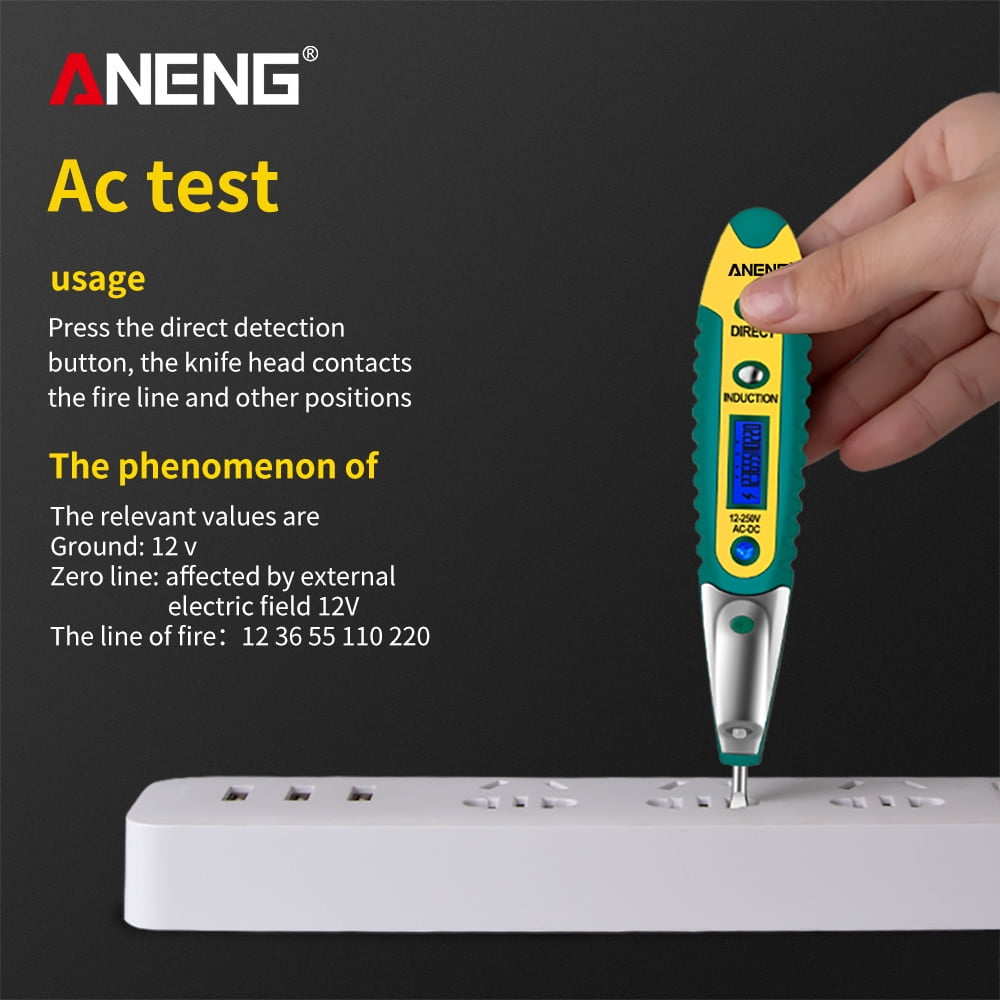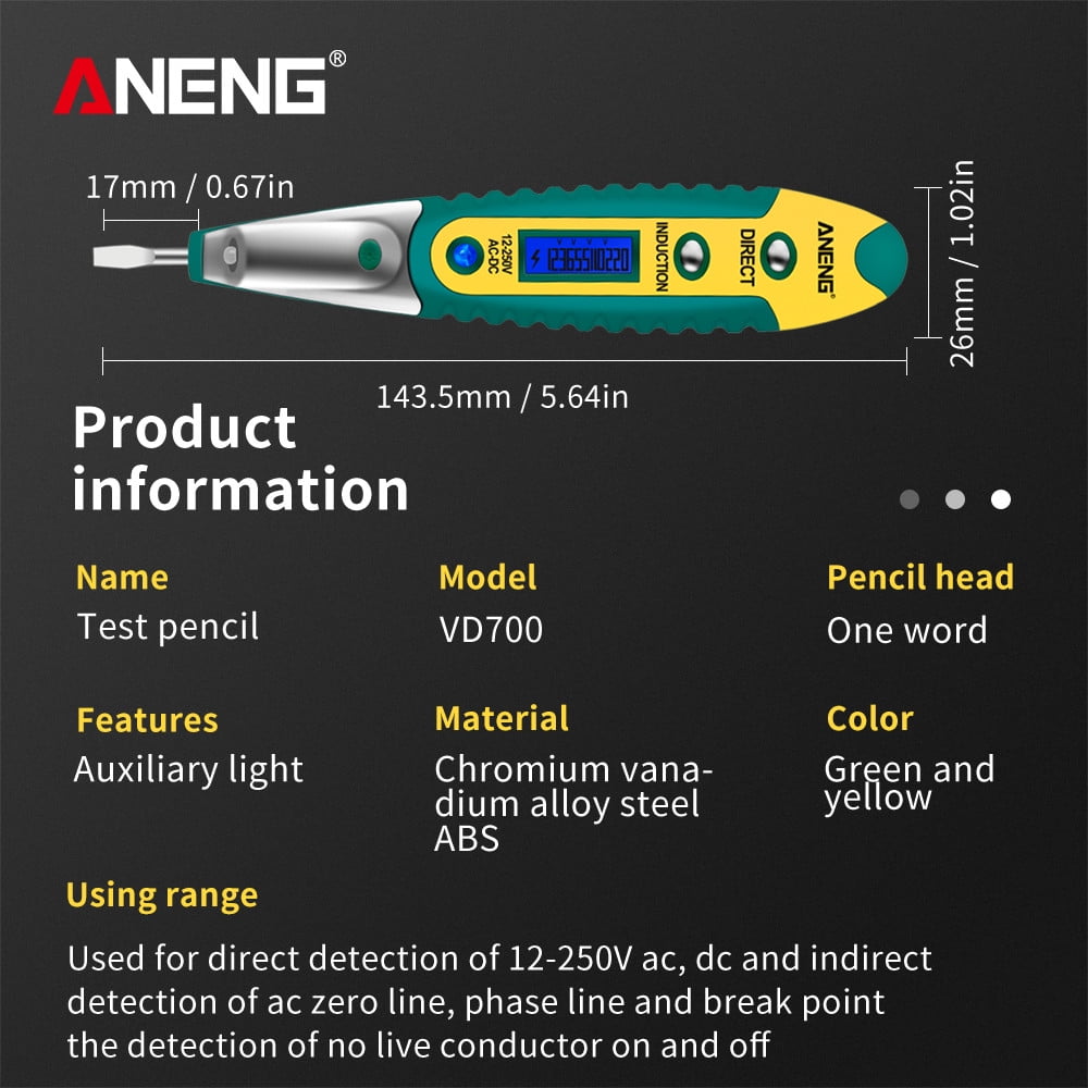 Features: High-quality Treatment: The bit of the testing pen is forged with chrome vanadium steel and overall heat treatment, featuring anti-slip and durability. One-hand Operation: With a compact appearance, this testing pen is comfortable to handle and easy to operate. Non-contact Detection: Capable of detecting whether the object is electrified or not and automotive high-voltage ticking line in non-contact method. HD LCD Blu-ray Screen: With the large blue light display screen, the test results can be read clearly in the dark. LED Auxiliary Lighting: Can be used as an emergency flashlight. Press and hold the auxiliary light switch to facilitate use at night when there is a power outage or low light. Wide Application: Firewire detection, zero line detection, line on/off detection, direct current detection, electric field induction test, high voltage induction test, leakage detection.