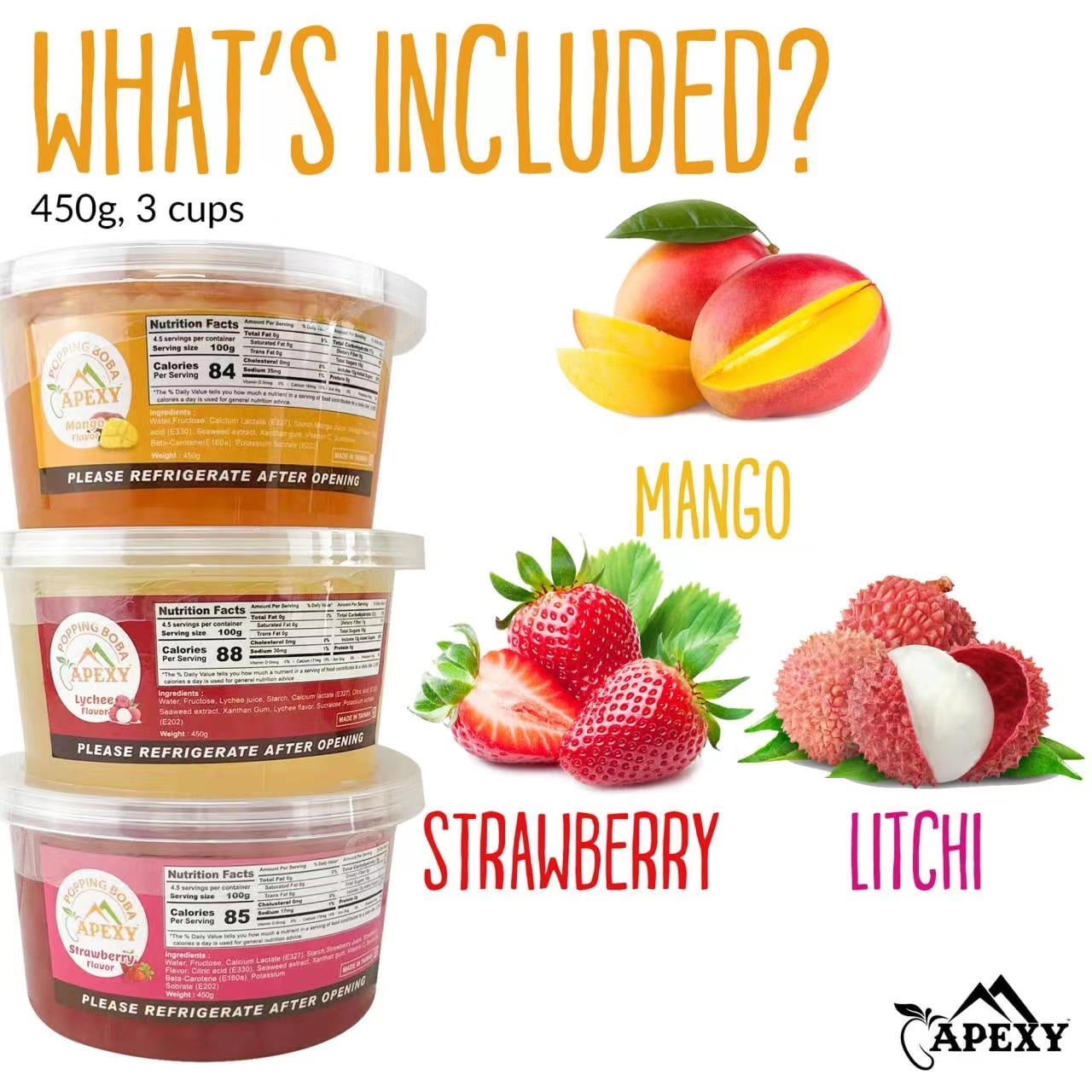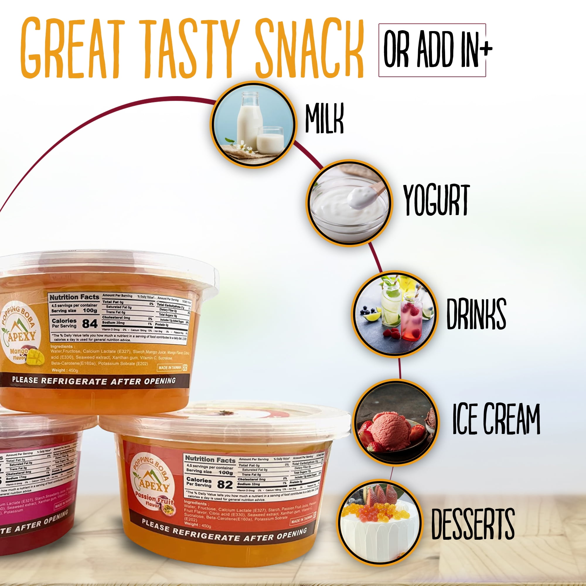 - Multiple Packs, Sizes, and Bundles – At APEXY we want to provide you options that fit your everyday life which is why our popping boba pearls flavors come in small, medium, and large cups, 2-6 packs, and in multiple flavor combinations.