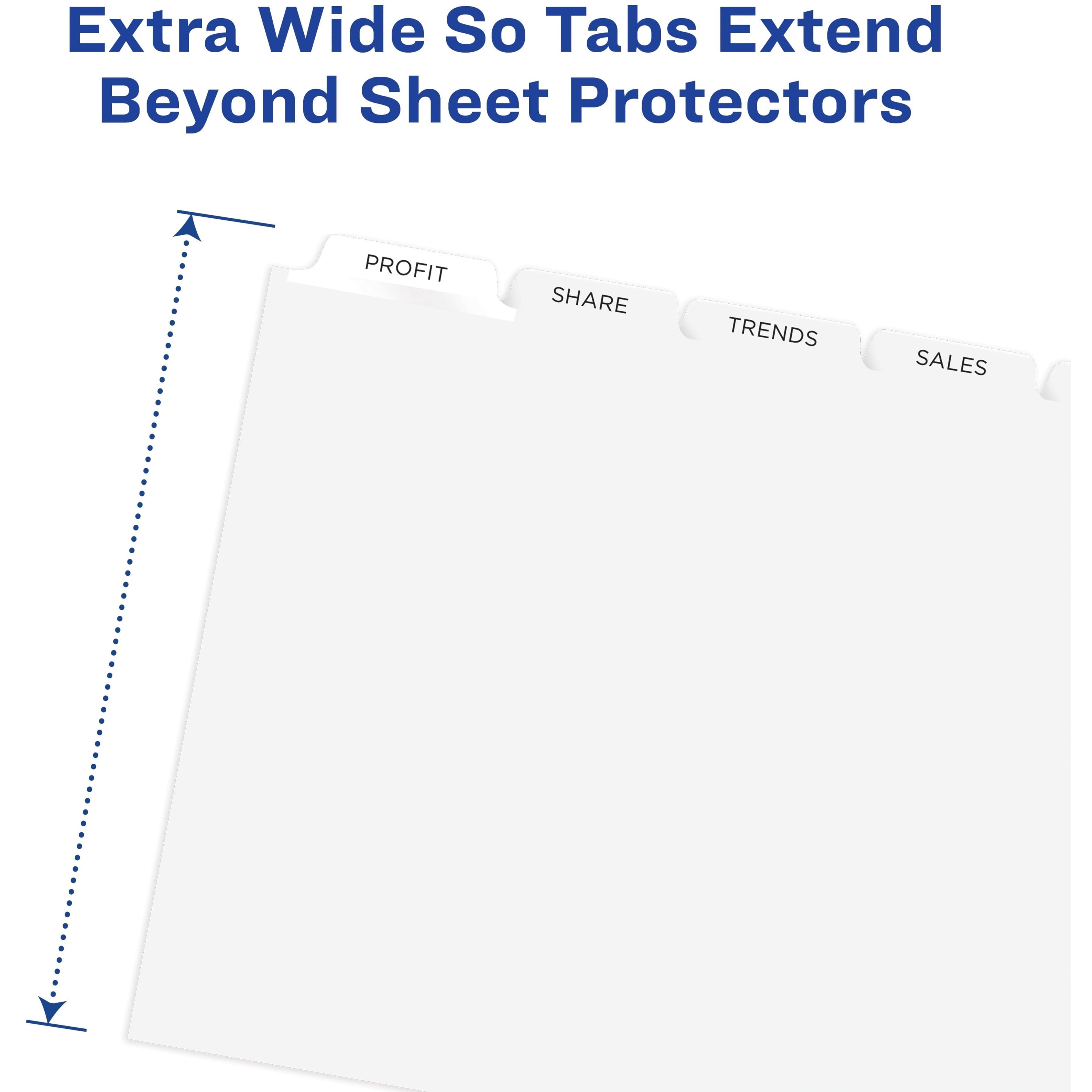 Personalize your tab titles and create dividers that look professionally printed. Avery offers many easy-to-use templates for Microsoft Word and other popular software programs. Simply print the section titles onto the clear labels using your laser or inkjet printer. The clear labels virtually disappear when applied to premium, extra-wide, white tabs. Label all tabs at once with Easy Apply clear labels. Perfectly align tab labels and label multiple sets quickly with Easy Apply label strips. Label sheet for labeling tabs is included. Three-hole punched dividers have a reinforced binding edge and are designed for use with three-ring binders.