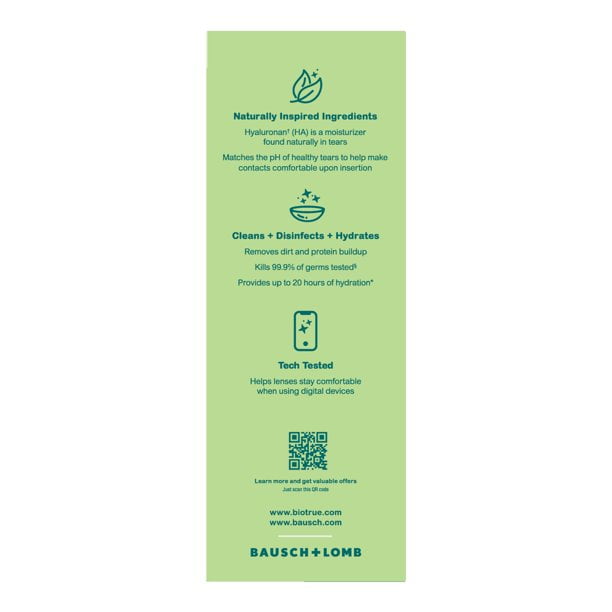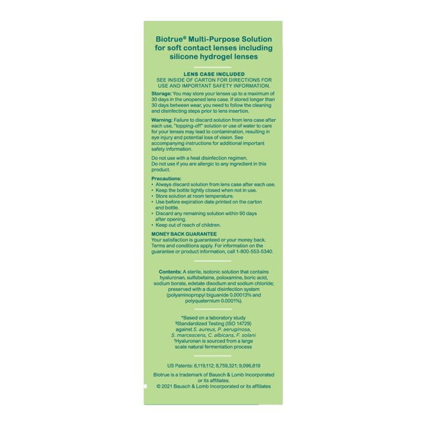 Because your eyes are so important. Eye Care B + L. See inside of carton for directions and important safety information. Storage: You may store your lenses up to a maximum of 30 days in the unopened lens case. If stored longer than 30 days between wear, you need to follow the cleaning and disinfecting steps prior to lens insertion.Uses:For soft contact lenses including silicone hydrogel lenses. Wearing contact lenses, especially in a world of less sleep and more computer use, makes it more challenging for eyes to stay comfortable and healthy. To care for your lenses and your eyes, a lens care solution that works like your eyes was created. Biotrue multi-purpose solution moistens in a way your eyes do as it uses a lubricant also found in your eyes, and it is pH balanced to match healthy tears. Helps prevent certain tear proteins from denaturing for clean lenses and fights germs for healthy lens wear. Free lens case included.Failure to discard solution from lens case after each use or use of water to care for your lenses may lead to contamination resulting in eye injury and potential loss of vision. See accompanying instructions for additional important safety information. Do not use a heat disinfection regimen. If you are allergic to any ingredient in this product, do not use. Always discard solution from lens case after each use. Keep the bottle tightly closed when not in use. Store solution at room temperature. Use before expiration date printed on the carton and bottle. Discard any remaining solution 90 days after opening. Keep out of reach of children.