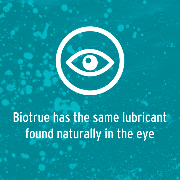 - Biotrue multi-purpose solution is inspired by the biology of the eye. It is enhanced with HA, a moisturizer found naturally in tears and its pH matches healthy tears, so contacts are comfortable when inserted