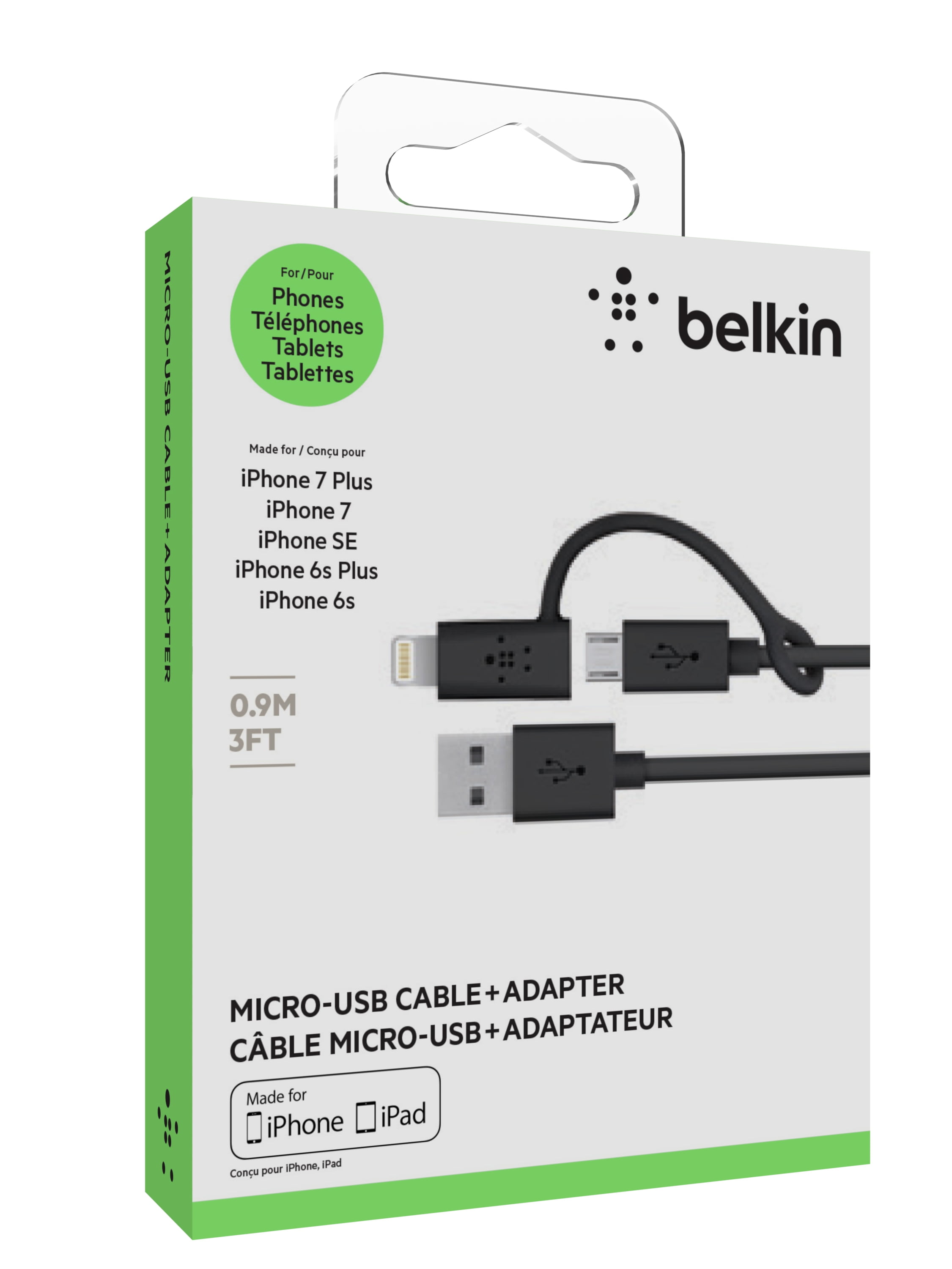- Belkin Micro-USB Cable with Lightning Connector Adapter charges multiple electrical devices