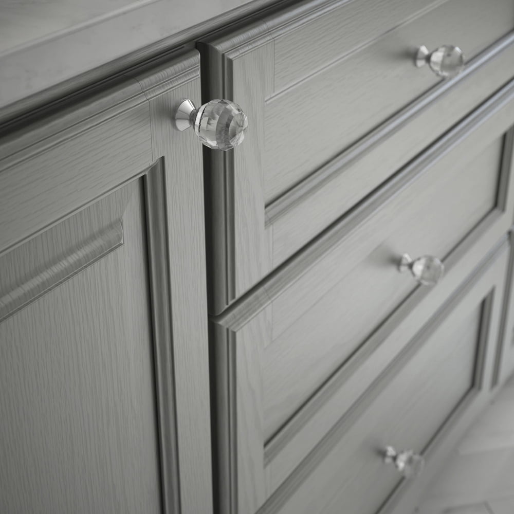 Create a touch of glamour in any room of your home with the Faceted Crystal Glass Knob from Better Homes & Gardens. The glimmer of the faceted glass knob paired with a sleek chrome base produces a casually modern ambiance. Sold in sets of two, with hardware included, it’s easy to complete a quick cabinet or furniture refresh project.