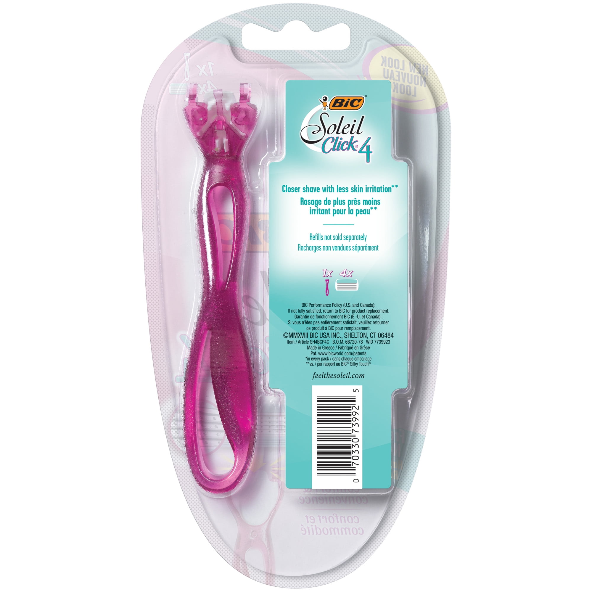 BIC Soleil Click 4 is a 4 blade female razor with flexible easy rinse blades for a close shave. 4 Flexible blades individually adjust to your curves to deliver a flawlessly smooth shave. Pivoting head for added control while shaving. Soothing Moisture Strip enriched with coconut milk for enhanced glide Comfort and Convenience.