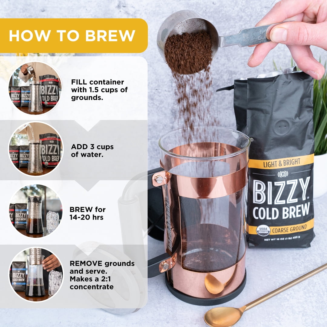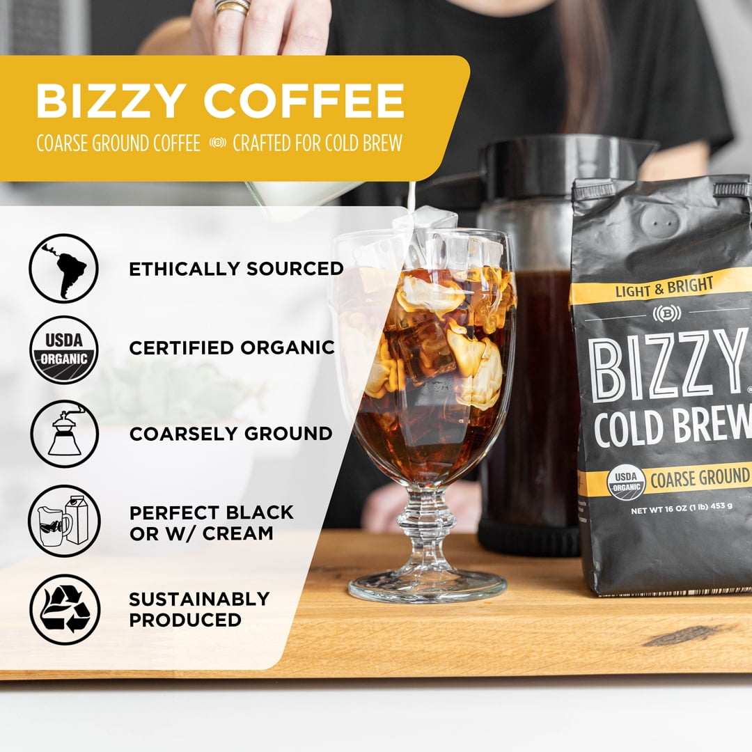 We have spent the last 5 years perfecting the cold brew coffee blend. Using a unique grinding process we are able to make a coarse ground coffee that is optimal for cold brewing. Our Arabica coffee beans from Central and South America are organic and ethically sourced – giving customers the highest quality beans possible. Now you can craft up your own cup of cold brew at home using our 16 Oz. or 32 Oz. (2 lb) bag of Light & Bright Bizzy Cold Brew Coffee.