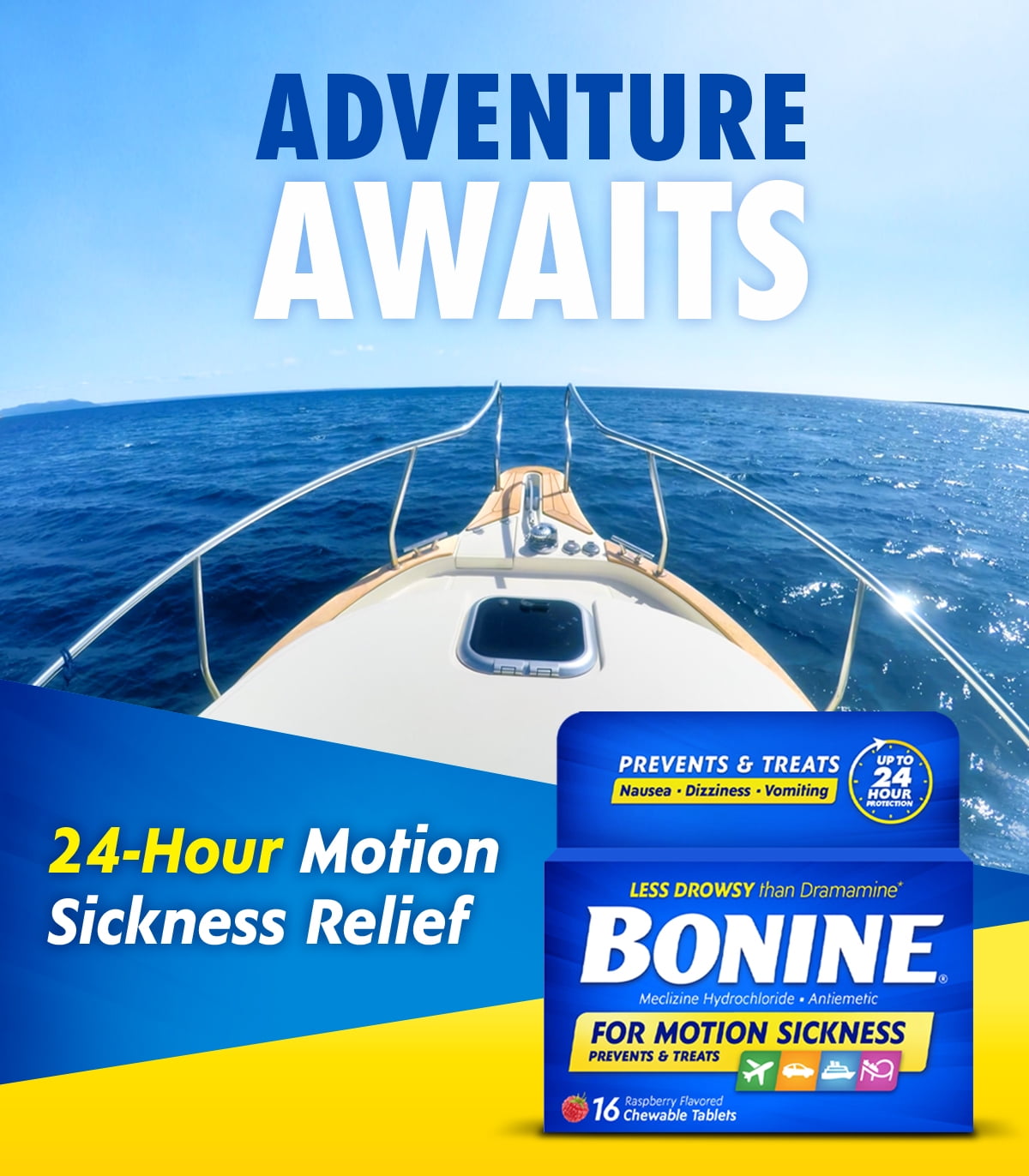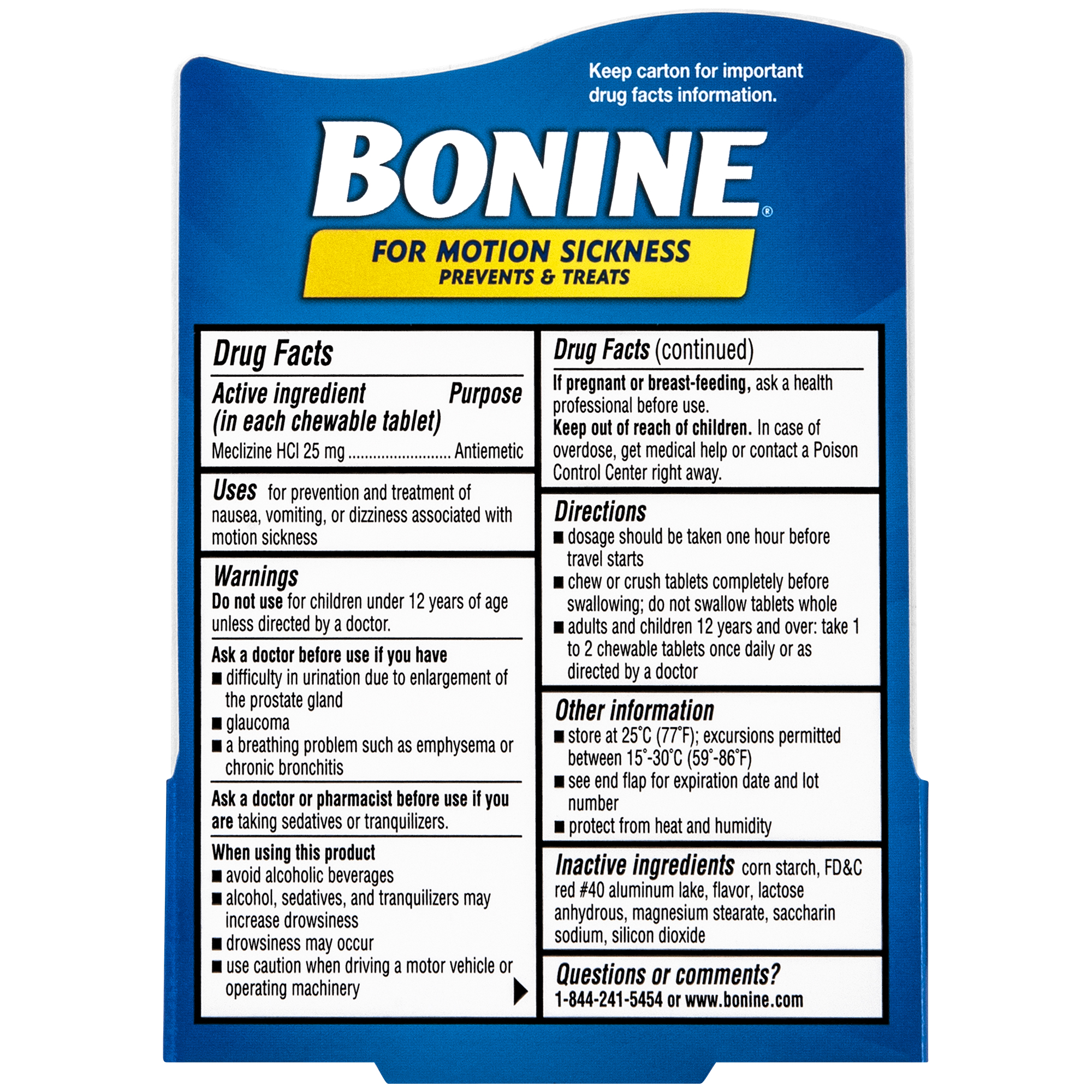 Bonine, the once-daily travel tablet, helps prevent dizziness, nausea, and vomiting associated with motion sickness so you can travel with confidence. Take one chewable raspberry-flavored tablet 60 minutes before hitting the road to prevent motion sickness, ensuring all-day protection. If you are prone to feeling queasy when you hop in a car, on a plane, or in a boat, this convenient bundle is for you. Enjoy your day with a remedy that’s as effective as Original Formula Dramamine with less drowsiness, helping you stay awake as you travel. Featuring a meclizine formula that provides nausea relief for up to 24 hours, Bonine motion sickness tablets are a must-have for your next cruise, road trip, or long bus ride.
