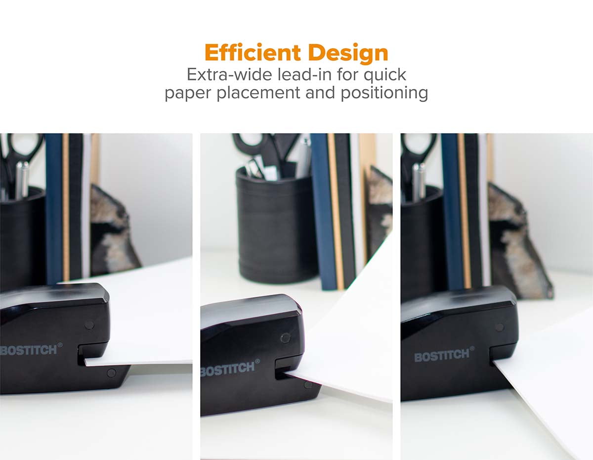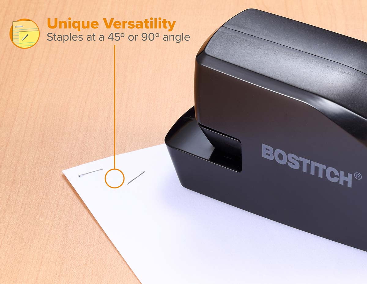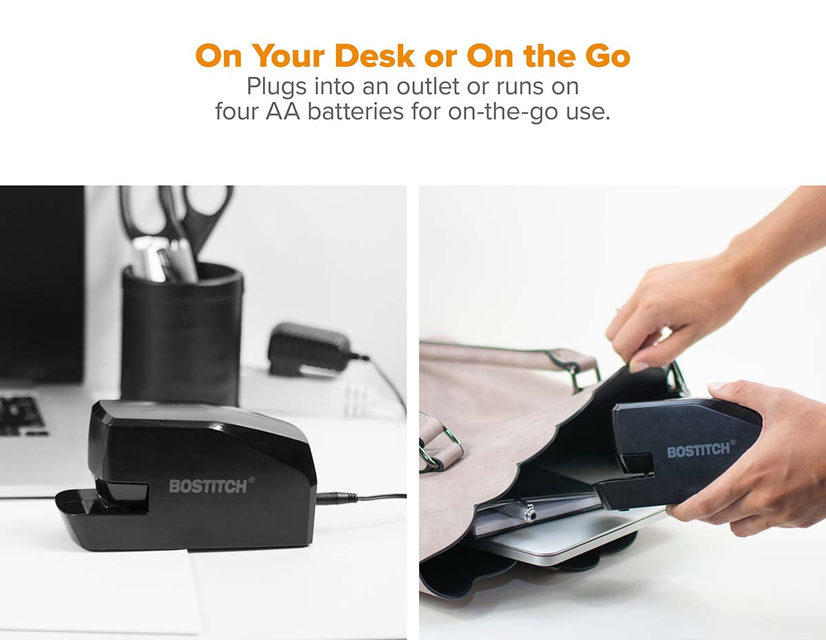 A sleek design engineered for reliable, everyday performance, this durable portable battery electric stapler can be powered by AC adapter or wire-free AA batteries for stapling sheets. Motorized design delivers quiet operation while the extra wide paper lead-in allows for quick positioning, stapling at a 45-degree or 90-degree angle, gets the job done without any frustrating staple jams for hassle-free stapling. Non-skid rubber base protects desktop surfaces and provides extra stability. Depending on setting, choose between an AC adapter for standard desktop use, or 4 AA batteries for on-the-go travel use (batteries not included). For best results, use with BOSTITCH Premium Standard Staples.
