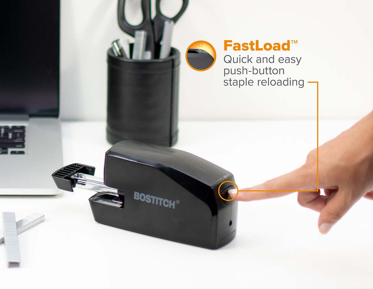 - Manufactured with a fast and easy push-button that reloads staples quickly and effortlessly to keep the stapling job going without interruption