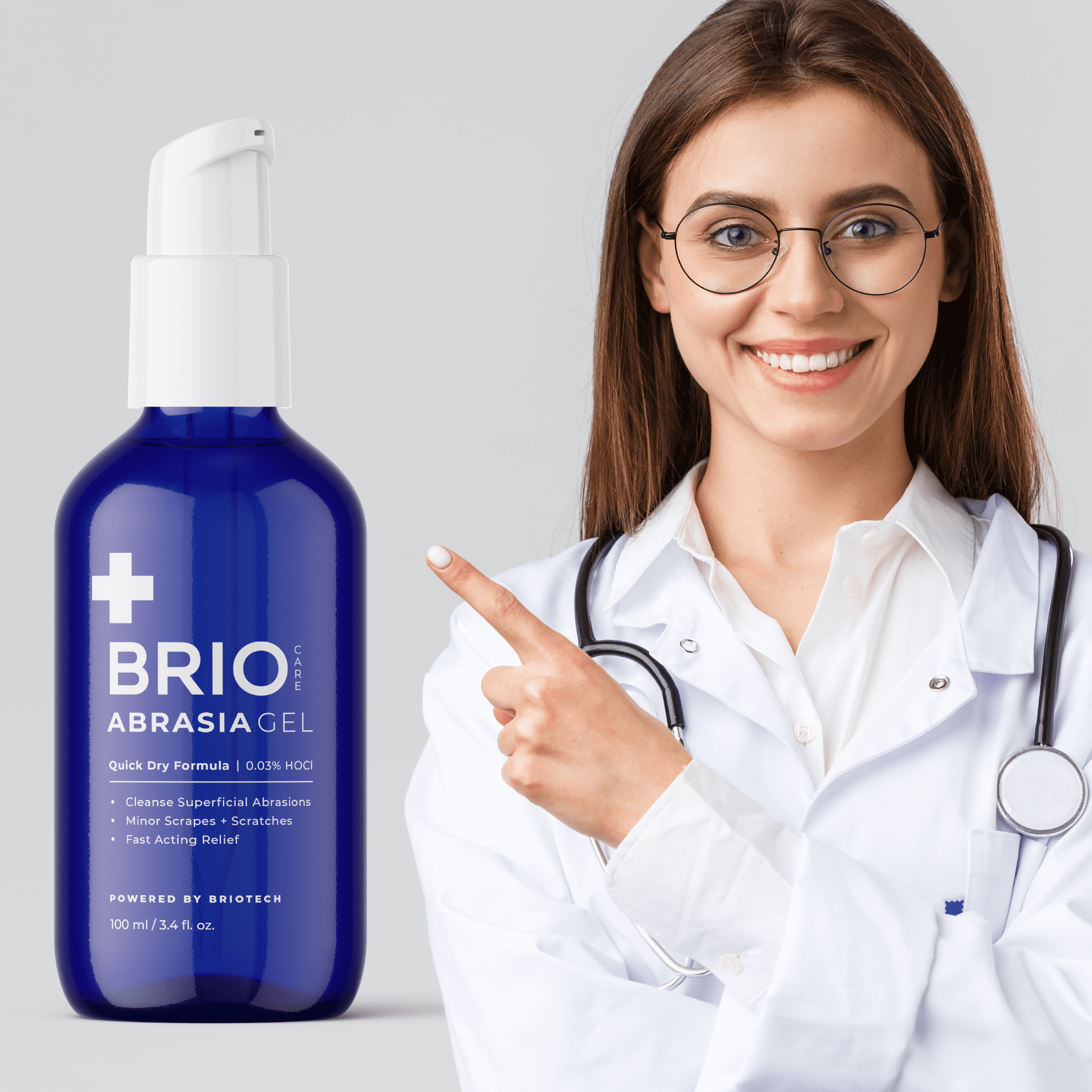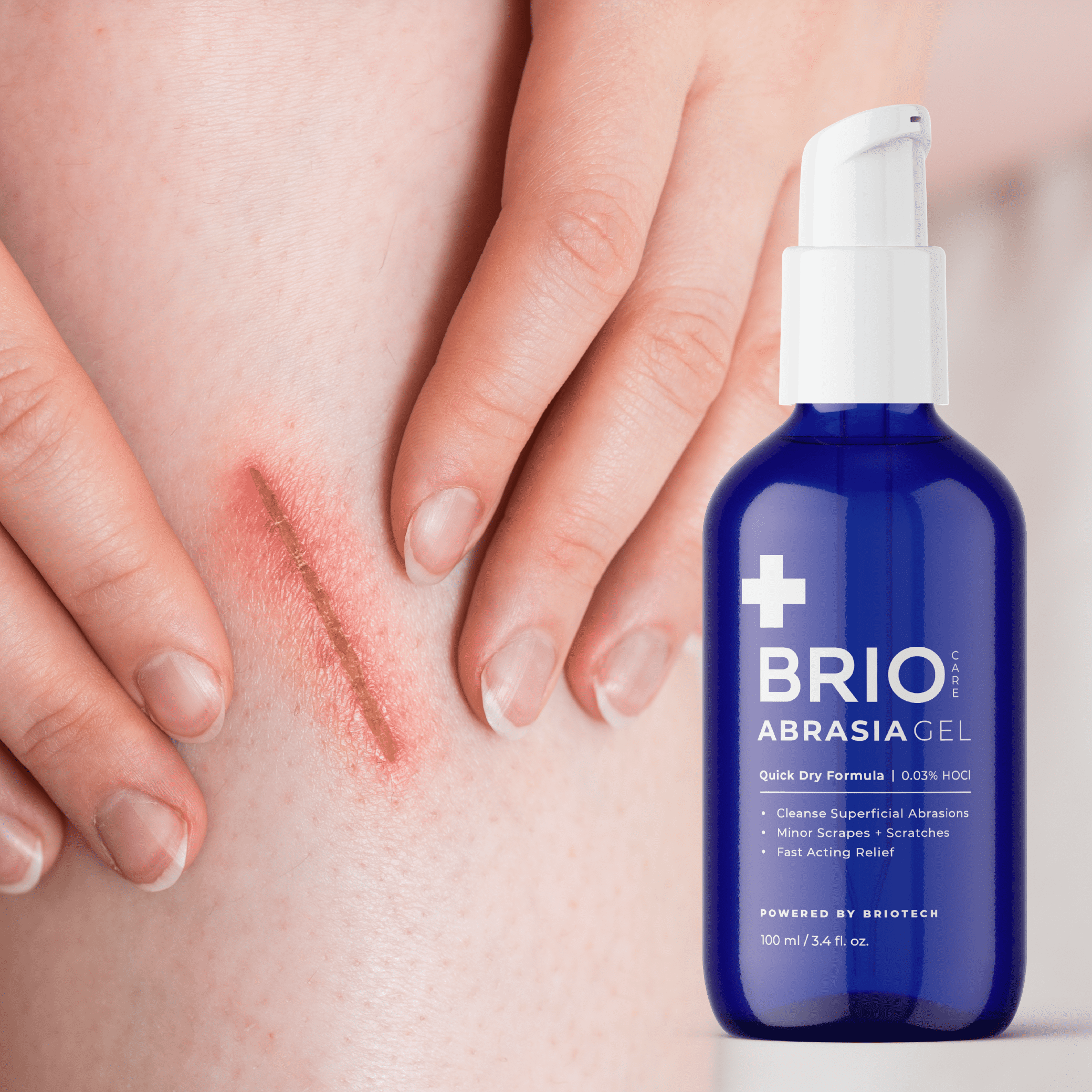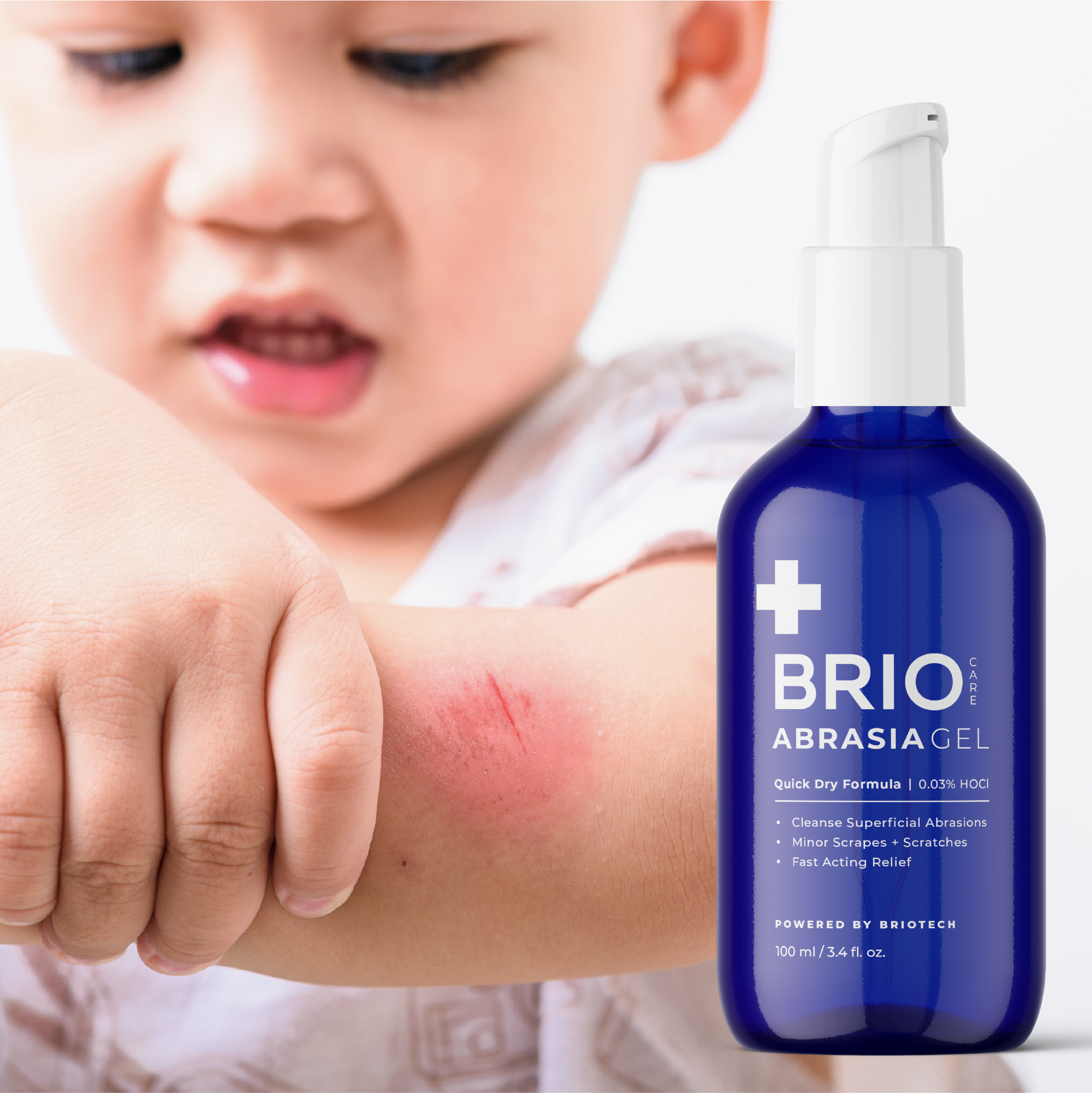Abrasia Gel is a non-sticky and quick drying serum solution to safely soothe discomfort, provide immediate relief, and cleanse superficial abrasions and minor scrapes — formulated with pure Hypochlorous. Gentle for all ages, non-stinging, and pH safe. Doctor Recommended