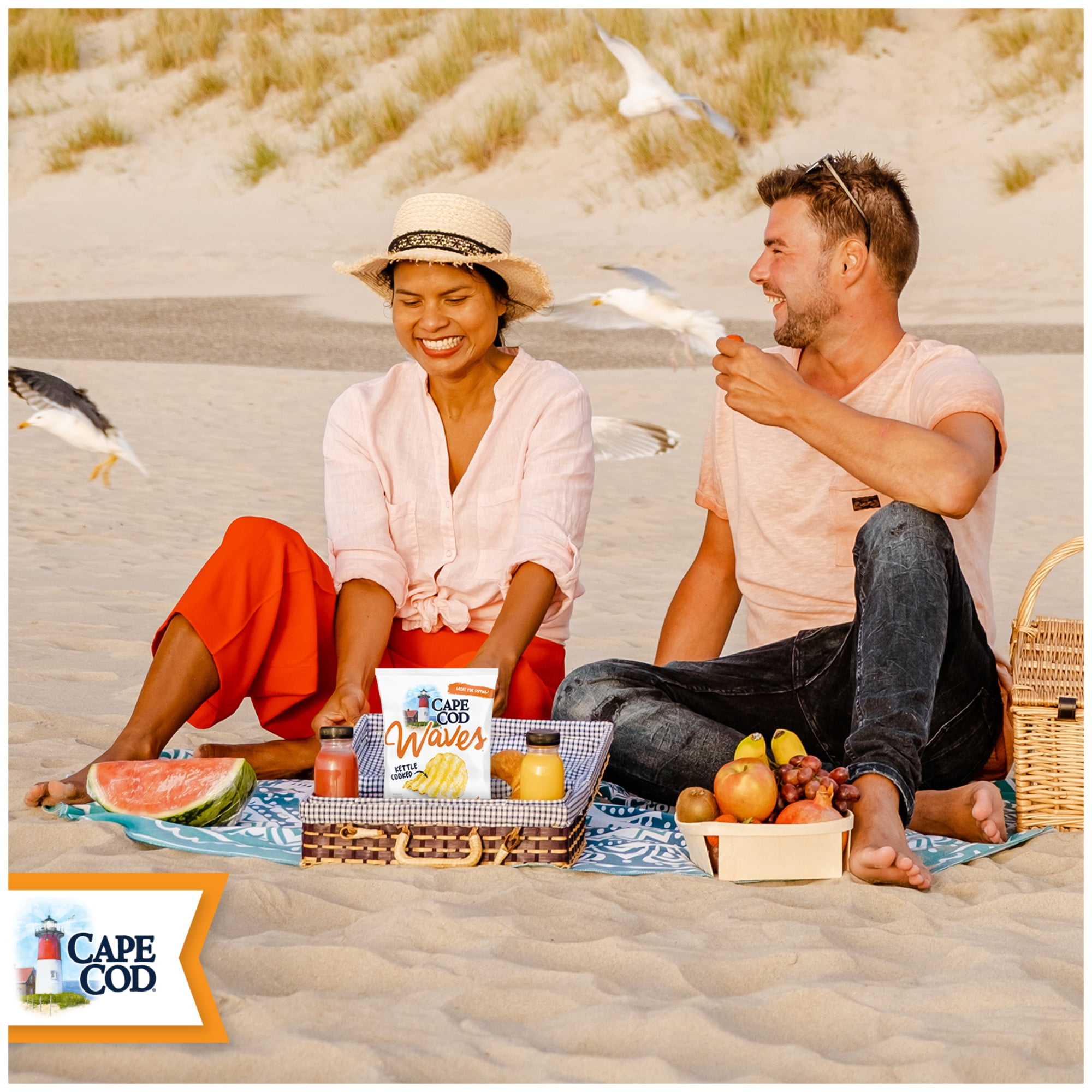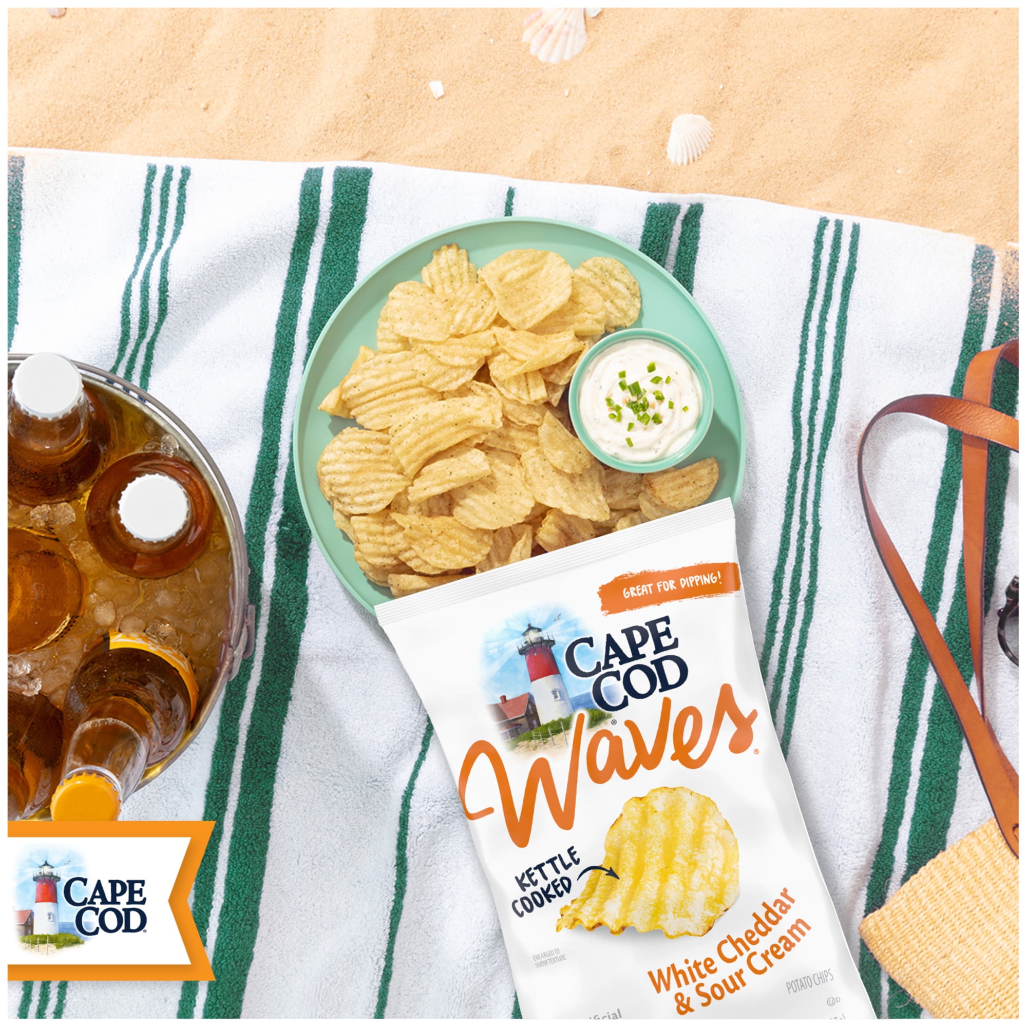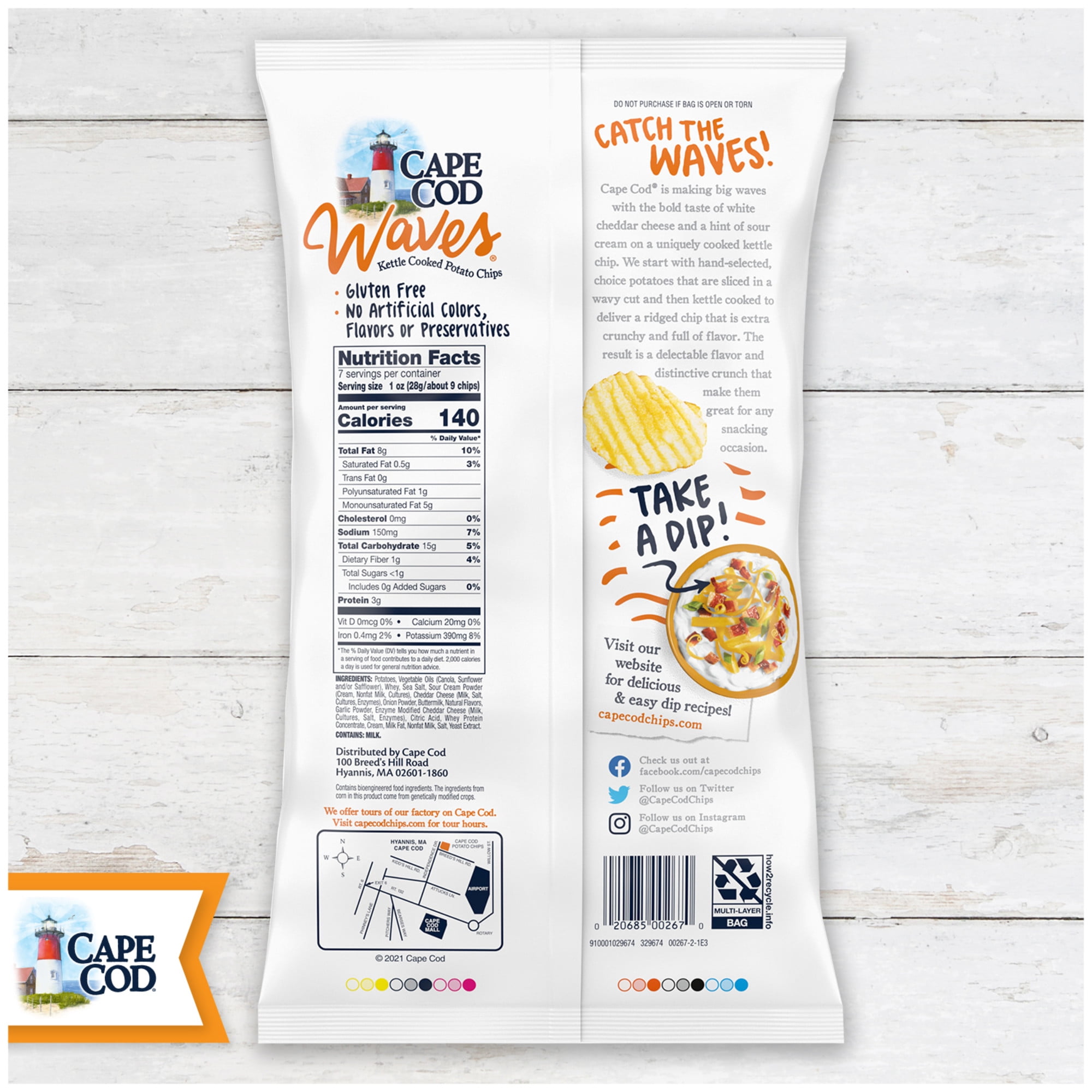 Cape Cod Waves White Cheddar & Sour Cream Kettle Cooked Chips are making waves. We start with carefully selected potatoes and slice them thick, in a wavy cut with deep ridges. They’re cooked one, small batch at a time in custom kettles until they reach a golden-amber hue. Finally, they’re deliciously finished with a perfect blend of cheddar and a hint of sour cream for extra richness. The result is a sturdy ridged chip that is hearty as it is delicious. The unique wavy shape of these kettle cooked chips is crafted to hold up to dip. These chips make a perfect lunchtime side and are delicious right out of the 7-ounce bag, as well as for dipping. Our potato chips are famous for their high quality and remarkable flavor, so be sure to try all the traditional and distinctly unique varieties. Every distinctive chip somehow feels like an invitation to come savor everything that’s special about Cape Cod Kettle Cooked Chips.