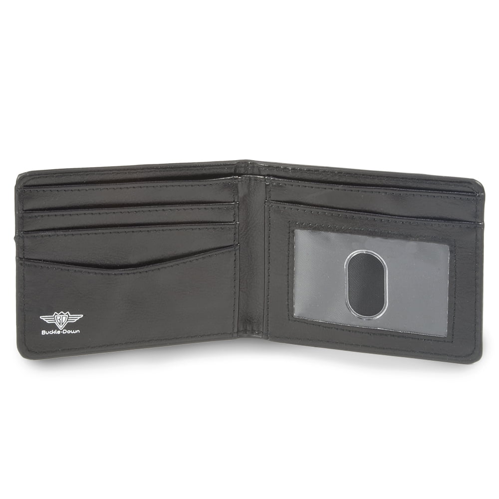 This bi-fold wallet features original artwork screen-printed on synthetic materials. The interior includes card slots and a billfold. The size is approximately 3.5"L x 4.25"W. The brand is officially licensed and made in the USA.