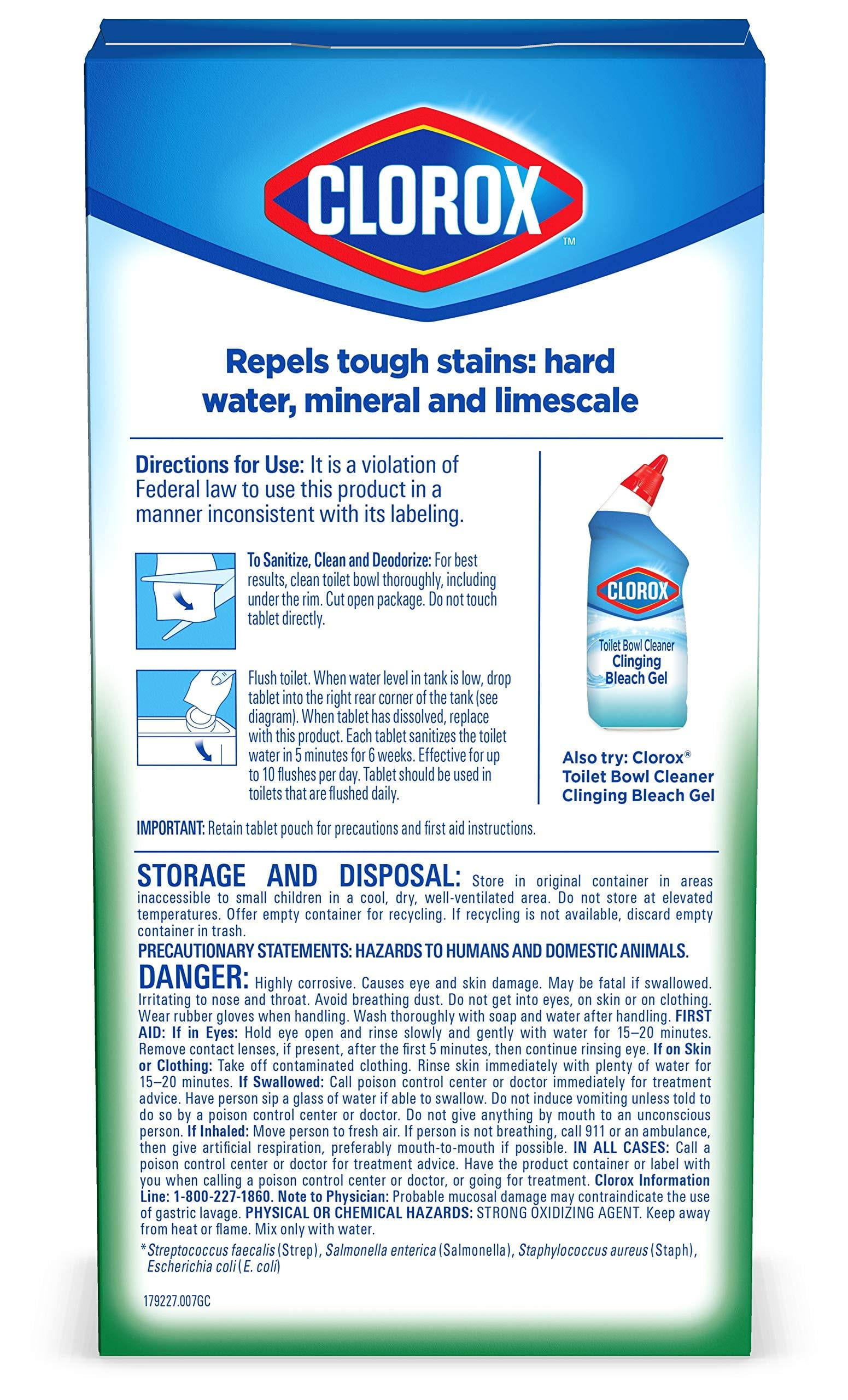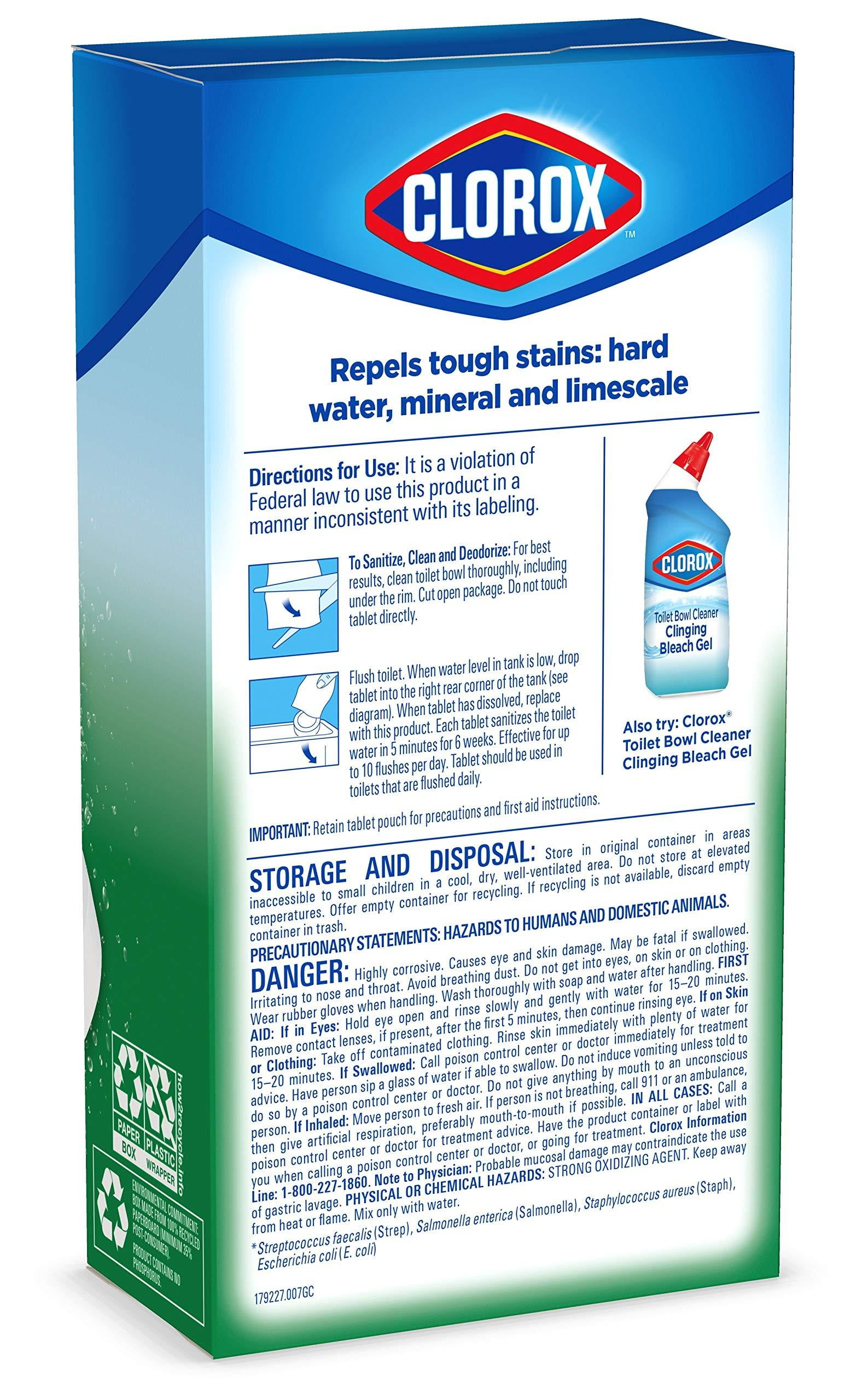 Clorox Automatic Toilet Bowl Cleaner tablet cleans and deodorizes with thepower of bleach and kills 99.9% of household bacteria in the toilet bowlwater. Each tablet sanitizes the toilet bowl water in 5 minutes, cleans for upto 3 months and helps prevent tough hard water, mineral and lime scale stains.These easy to use tablets keep your toilet smelling fresh and sparkling cleanwith every flush, leaving bowl water crystal clear. To sanitize, clean anddeodorize, simply drop a tablet in the toilet tank and let it do its work. Thetablet does not harm the septic tank. With Clorox, you know your toilet bowlis clean and disinfected.