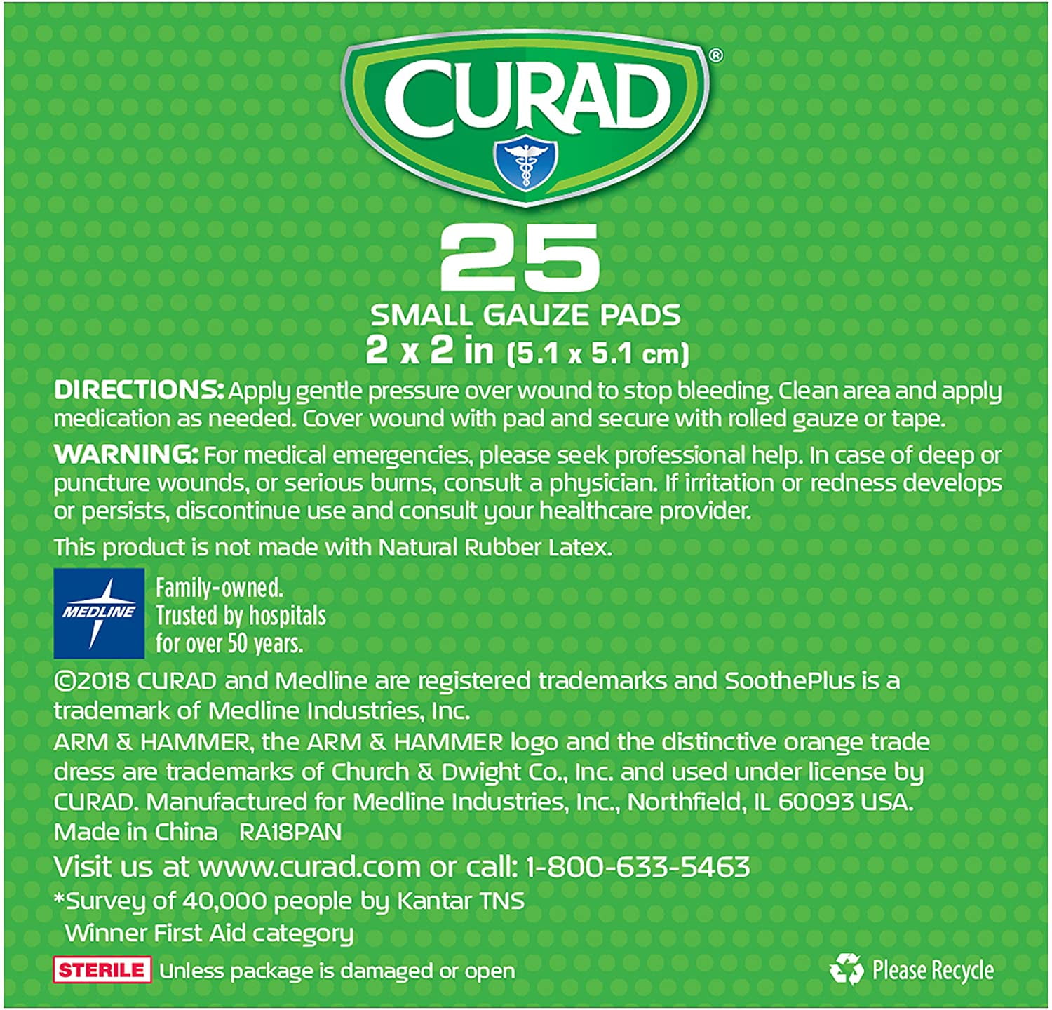 Curad Sootheplus Small Gauze Pads with Baking Soda, Arm & Hammer 2 x 2 in, 25 Ea, 6 Pack