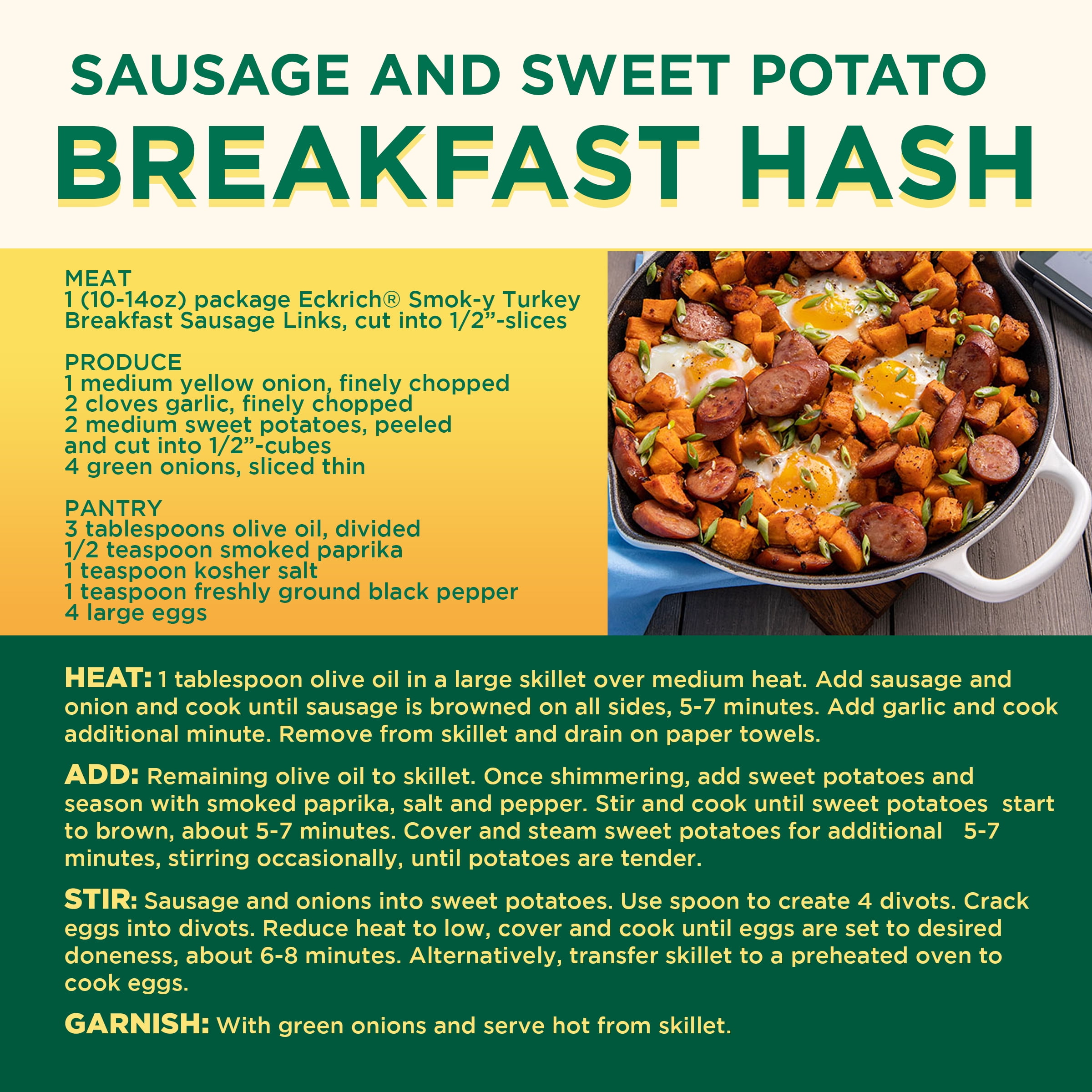 Eckrich Smok-y Cheddar Breakfast Sausage Links deliver irresistible breakfast sausage flavor to elevate your next breakfast meal. Eckrich Smok-y Cheddar Breakfast Sausage Links are naturally hardwood smoked and crafted with a special blend of spices for rich savory flavor. Cook the sausages low and slow on the griddle until they’re sizzling with flavor or simmer the meat on the stovetop for a nice and juicy breakfast sausage meal. These cheddar smoked sausages are fully cooked, so you can easily heat and serve a meal in minutes. Whether you’re preparing for the next family breakfast or morning meal, pick up a pack of Eckrich Smok-y Cheddar Breakfast Sausage Links for a smoked sausage everybody will love.