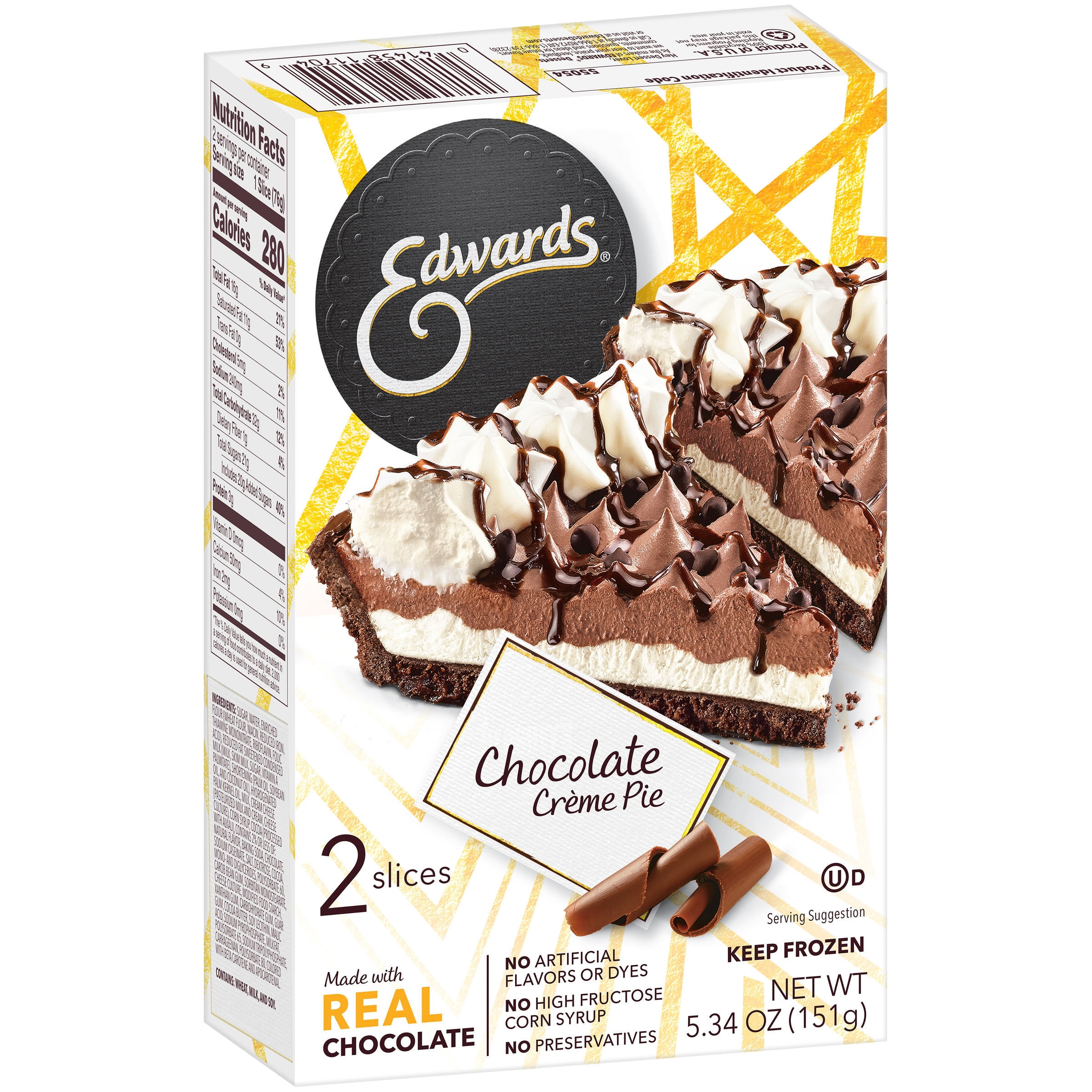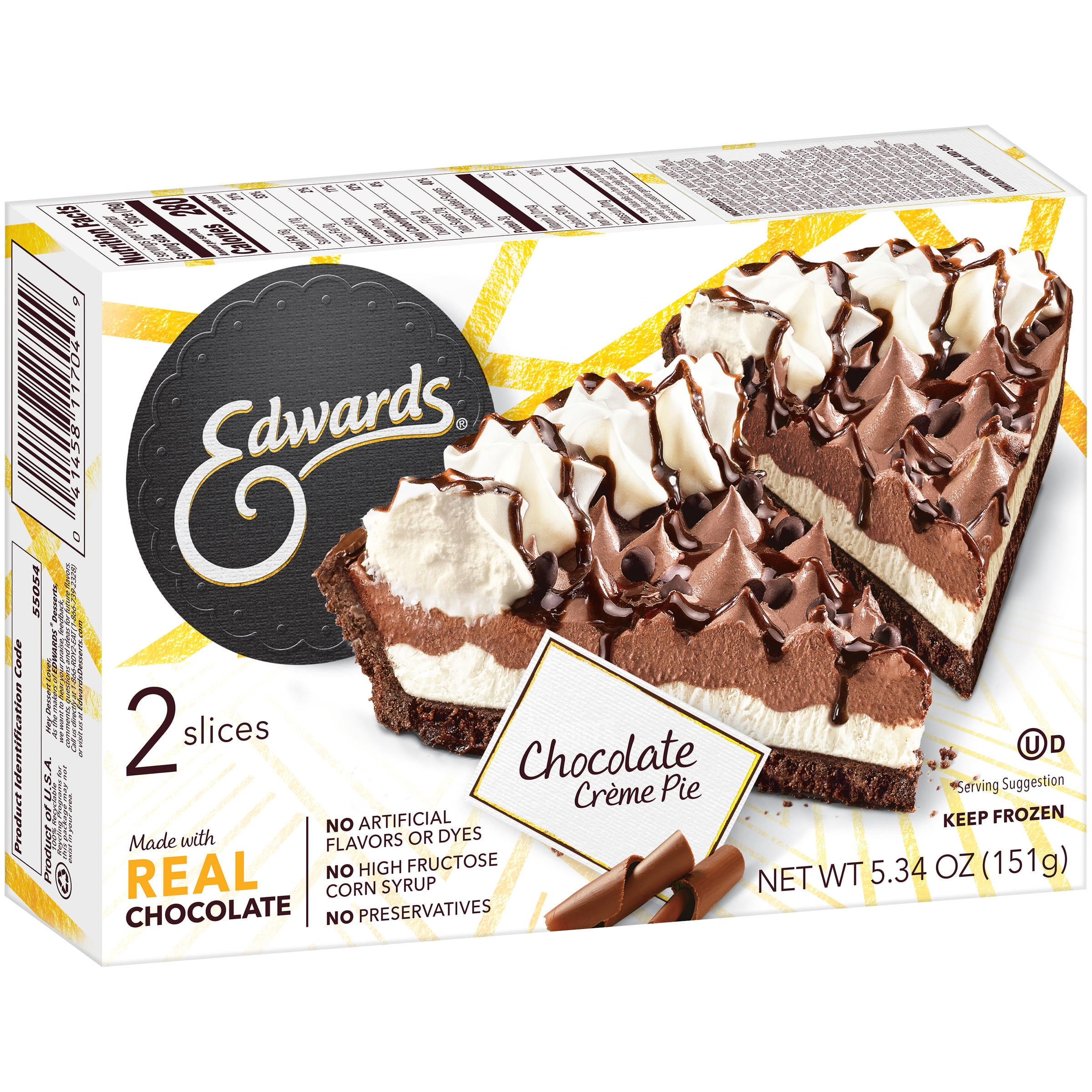 EDWARDS DESSERTS – Exceptional indulgences made effortless! Our smooth, decadent frozen pies are meticulously whipped, sprinkled, and drizzled to extravagant perfection. All you have to do is relax and treat yourself to the rich flavor, velvety crème layers, and fresh-from-the-oven cookie crumb crust. Our two slices of Edwards Chocolate Crème Pie are made with luscious layers of chocolate and vanilla crème filling, then topped with Hershey’s chocolate drizzle, chocolate chips, and whipped crème rosettes. Simply thaw and enjoy a slice or two!