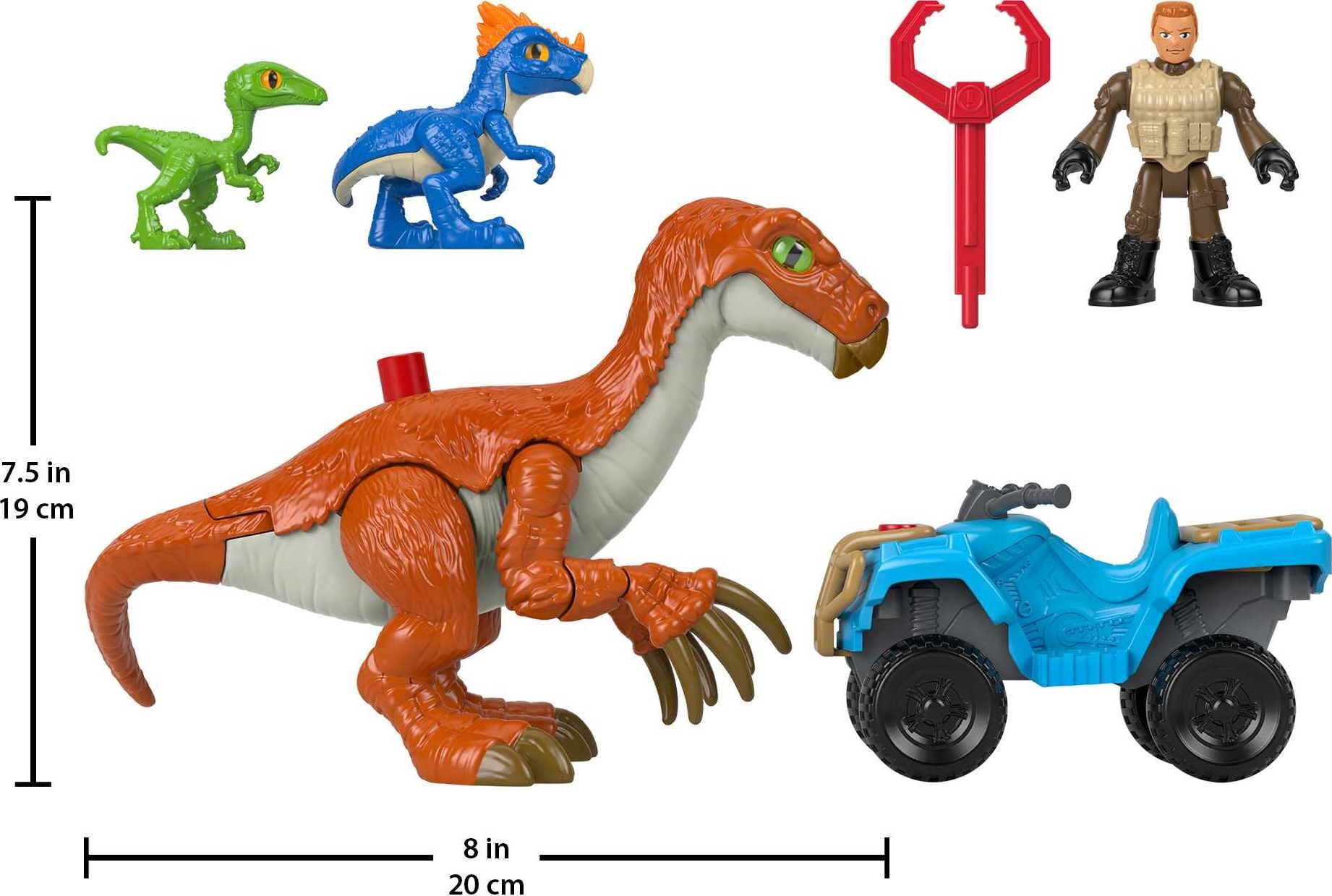 - Set includes 1 Therizinosaurus dinosaur, 1 Compy dinosaur, 1 Dracorex dinosaur, 1 scout figure, 1 vehicle and 1 projectile