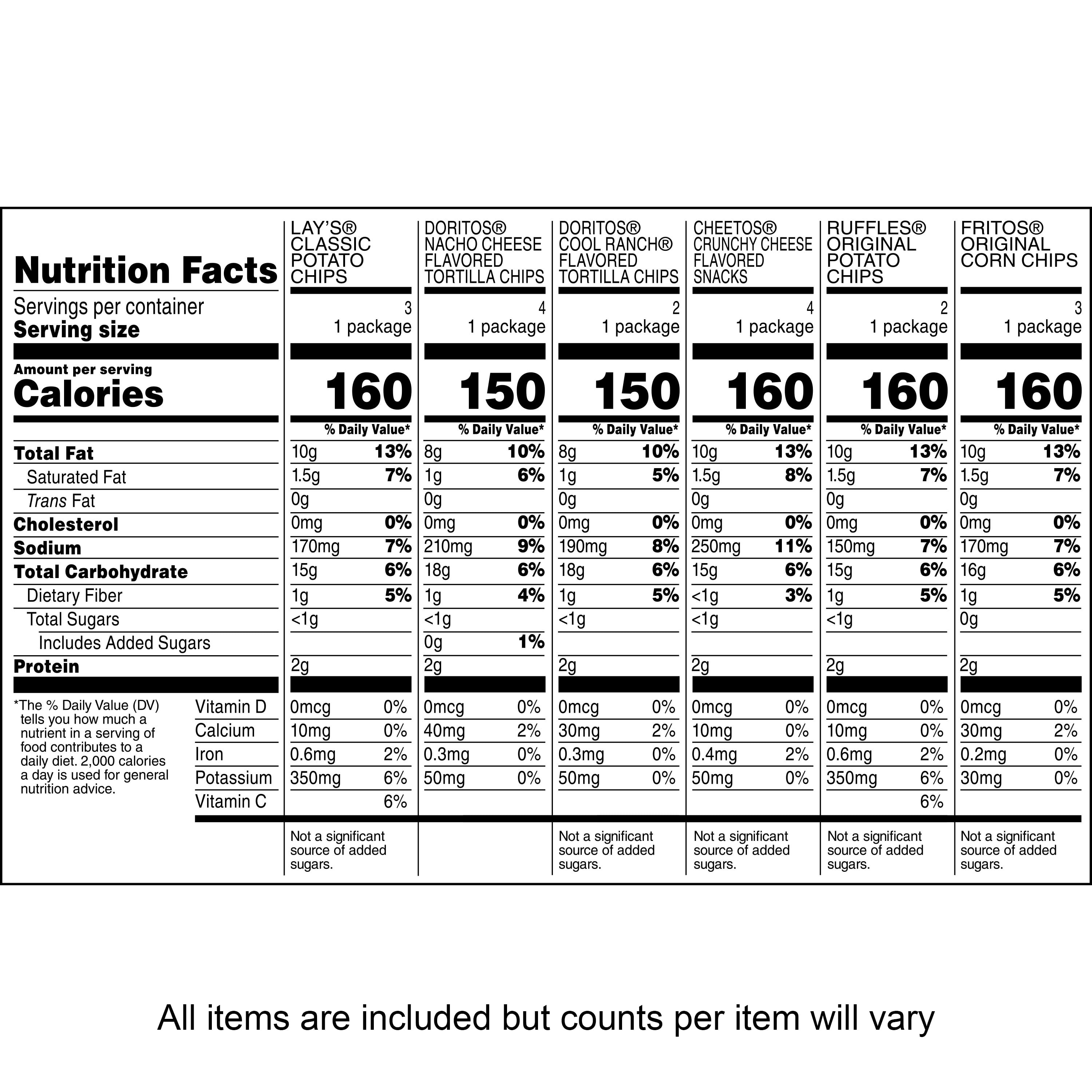 - 18 Count Mix includes: Lay’s Classic potato chips, Doritos nacho cheese flavored tortilla chips, Cheetos crunchy cheese snacks, Ruffles original potato chips, and Fritos original corn chips.