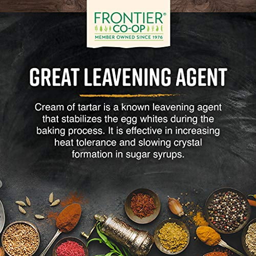 An indispensable ingredient in baking, Frontier® Cream of Tartar acts as a leavening agent in cakes, quick breads and souffles when combined with baking soda and water. An essential ingredient in Snickerdoodle cookies, it aids in stiffening egg whites — just add a pinch of cream of tartar while beating — preventing sugar syrups from crystallizing and reducing discoloration of boiled vegetables. Our bulk cream of tartar is kosher certified and non-irradiated.