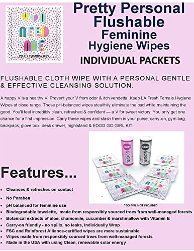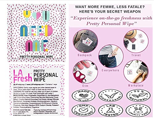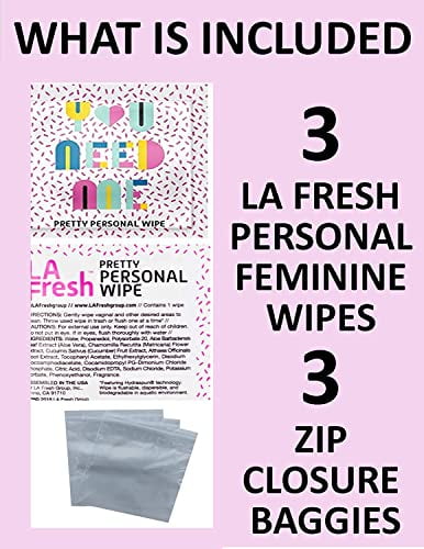 - 3) LA Fresh Personal Feminie Wipes. Here’s Your Secret Weapon. To Prevent Your V From Odor & Itch Vendetta, Ph Balanced, Stealthily Eliminate The Bad While Maintaining The Good. Feel Incredibly Clean, Refreshed & Confident – A V For Sweet Victory. These Towelettes Are Flushable And Discreet Enough To Slip Into Your Pocket. Wipes Are Biodegradable, Compostable and Made In the USA. Natural Ingredients Include Botanical Extracts Of Aloe, Chamomile, Cucumber & Marshmallow With Vitamin E