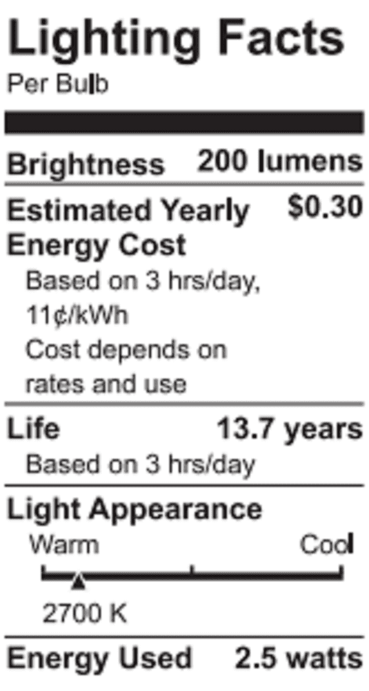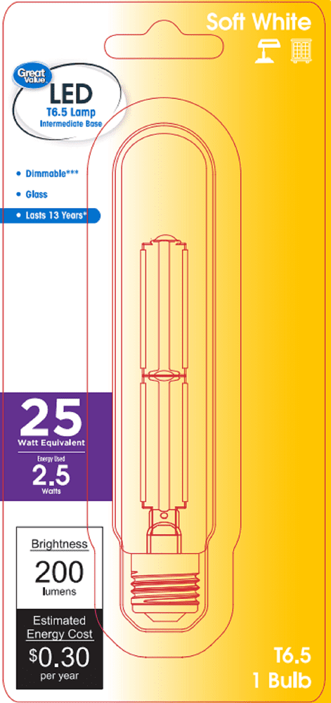 Minimum starting temperature -20°F (-28.9° C). This device complies with part 15 of the FCC rules. Operation is subject to the following two conditions:1.) This device may not cause harmful interferenceand2.) This device must accept any interference receivedincluding interference that may cause undesired operation.$2.71 savings per year** vs incandescent** ((Incandescent watts – LED watts) x .11 p/kwh x 1095 hours)/1,000kwhBrighten your home and save money and energy with a Great Value LED 2.5 Watt T6.5 Tube Clear Soft White Bulbs This clear LED tube light bulb is perfect for desk lamps and other fixturesand it provides soft white light. The LED element creates bright but energy-efficient lightproducing 200 lumensthe equivalent of 25 wattsusing only 2.5 watts. It’s far more durable than traditional incandescent lightinglasting 13 years and costing only an estimated $0.30 per year. Modernize your lighting with a Great Value LED 2.5 Watt T6.5 Tube Clear Soft White BulbsGreat Value products provide families with affordablehigh quality grocery and household consumable options. With our wide range of product categories spanning grocery and household consumableswe offer you a variety of products for your family’s needs. Our products are conveniently available online and in Walmart stores nationwideallowing you to stock up and save money at the same time.THIS DEVICE IS NOT INTENDED FOR USE WITH EMERGENCY EXIT LUMINAIRESOR EMERGENCY EXIT LIGHTS.CAUTION: Discontinue use if damaged. Turn power off before installation or removal.May not be compatible with all dimmers.