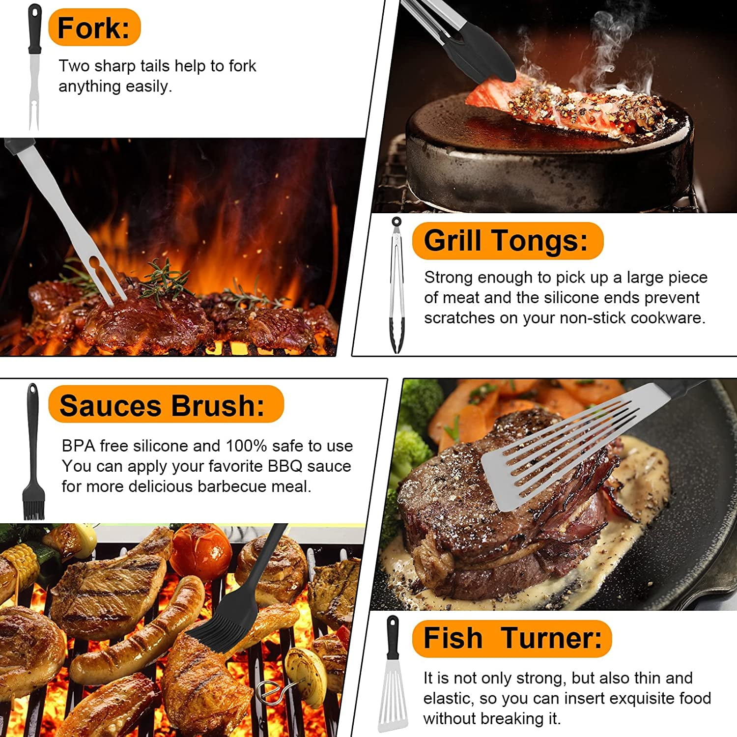 - 【Easy to Storage & Carry】Each tool can be placed in an orderly manner and better protected in the compact storage box. Easy to store and can take it anywhere anytime to comping or picnic. Convenient hangers are provided for easy storage and food grade grill tools are easily cleaned with warm, soapy water. Now anyone,newbie or master griller can enjoy grilling much faster,easier,cleaner.