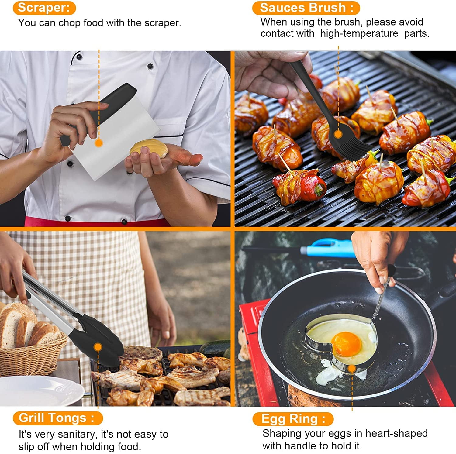 - 【14pcs Professional Barbecue Tools Set】Professional Griddle Accessories set has all the grill tools you need.It can meets all the essentials of your daily backyard barbecue and camping activities.It includes 2 Egg Ring, 1 Grill Tongs, 1 Griddle Chopper, 1 Cleaning Brush, 1 Blade Scraper, 1 Spatula, 1 Slotted Spatula, 1 Burger Scraper, 1 Medium Turner Spatula, 2 Spice Shaker, 1 Grill Brush and 1 Griddle Fork.