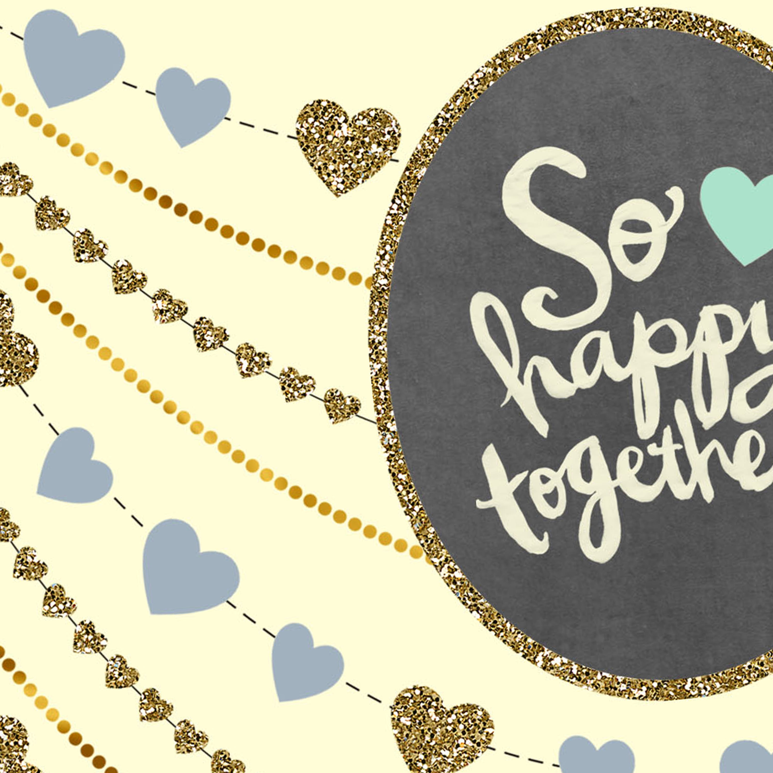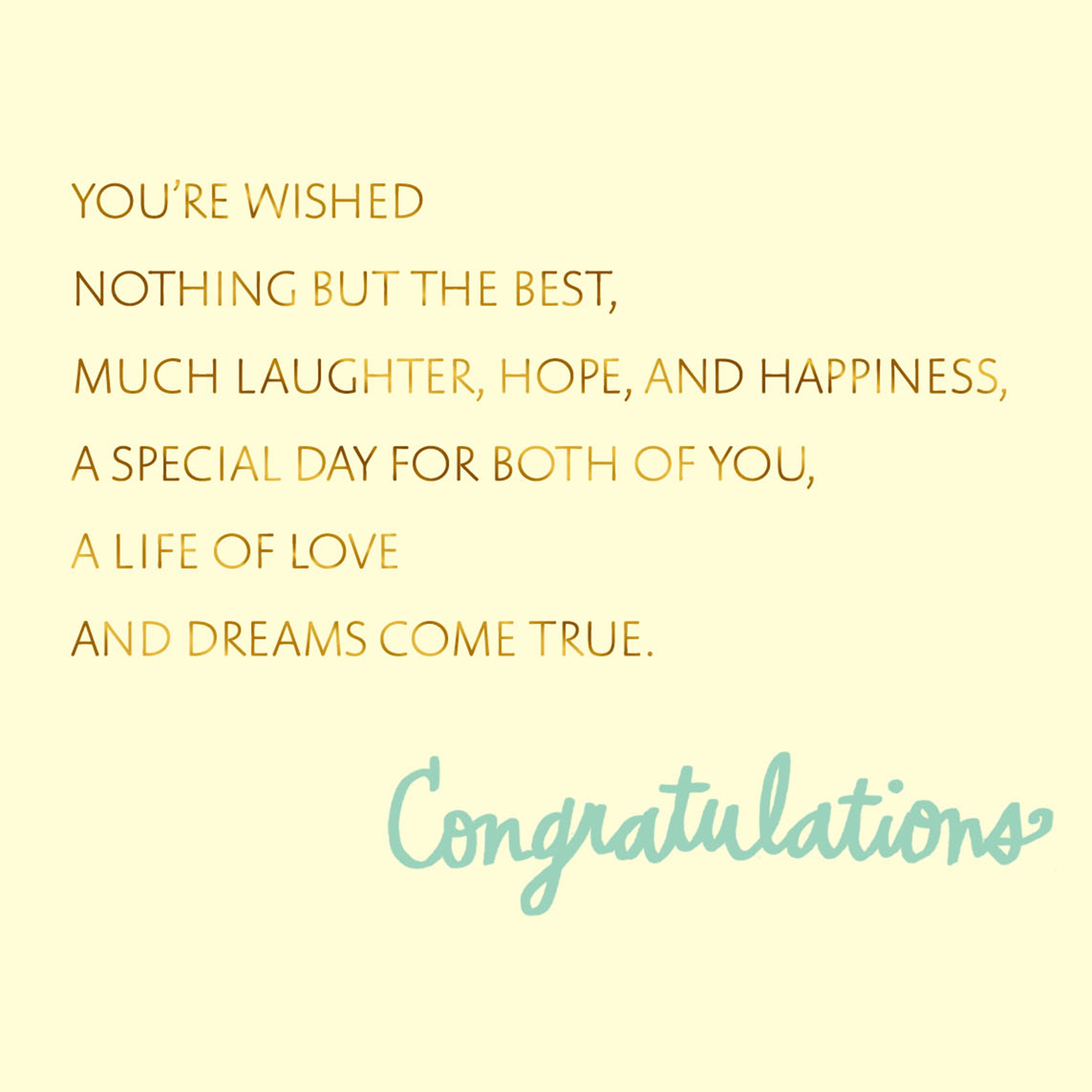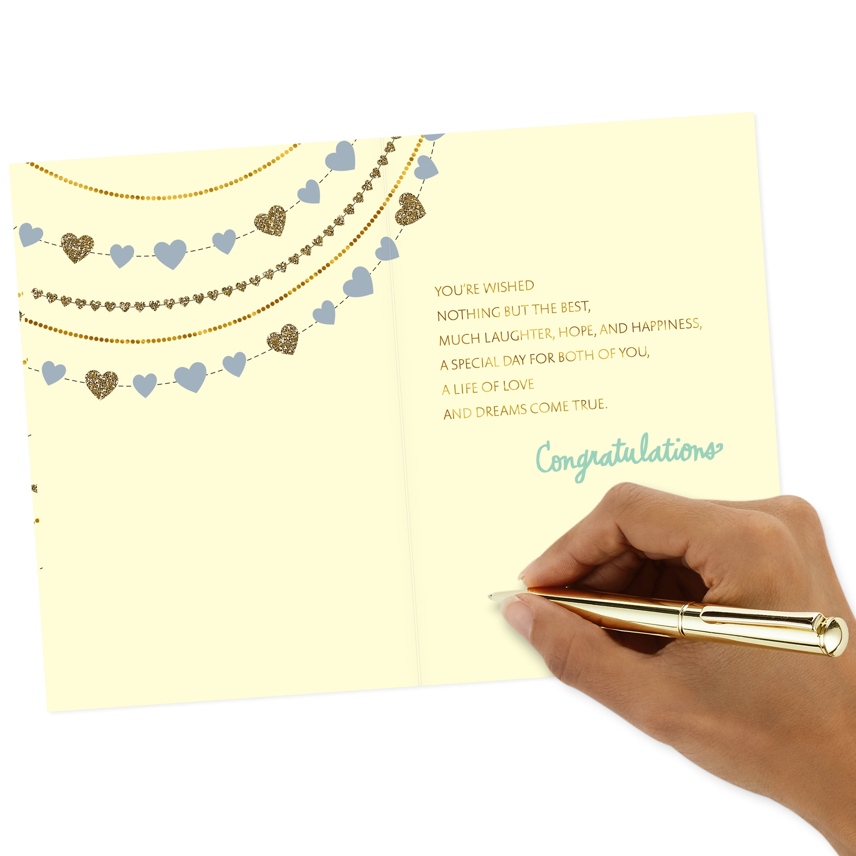- Cover features a banner of hearts with glitter accents. Inside message reads, "You’re wished nothing but the best, Much laughter, hope, and happiness, A special day for both of you, A life of love and dreams come true. Congratulations."