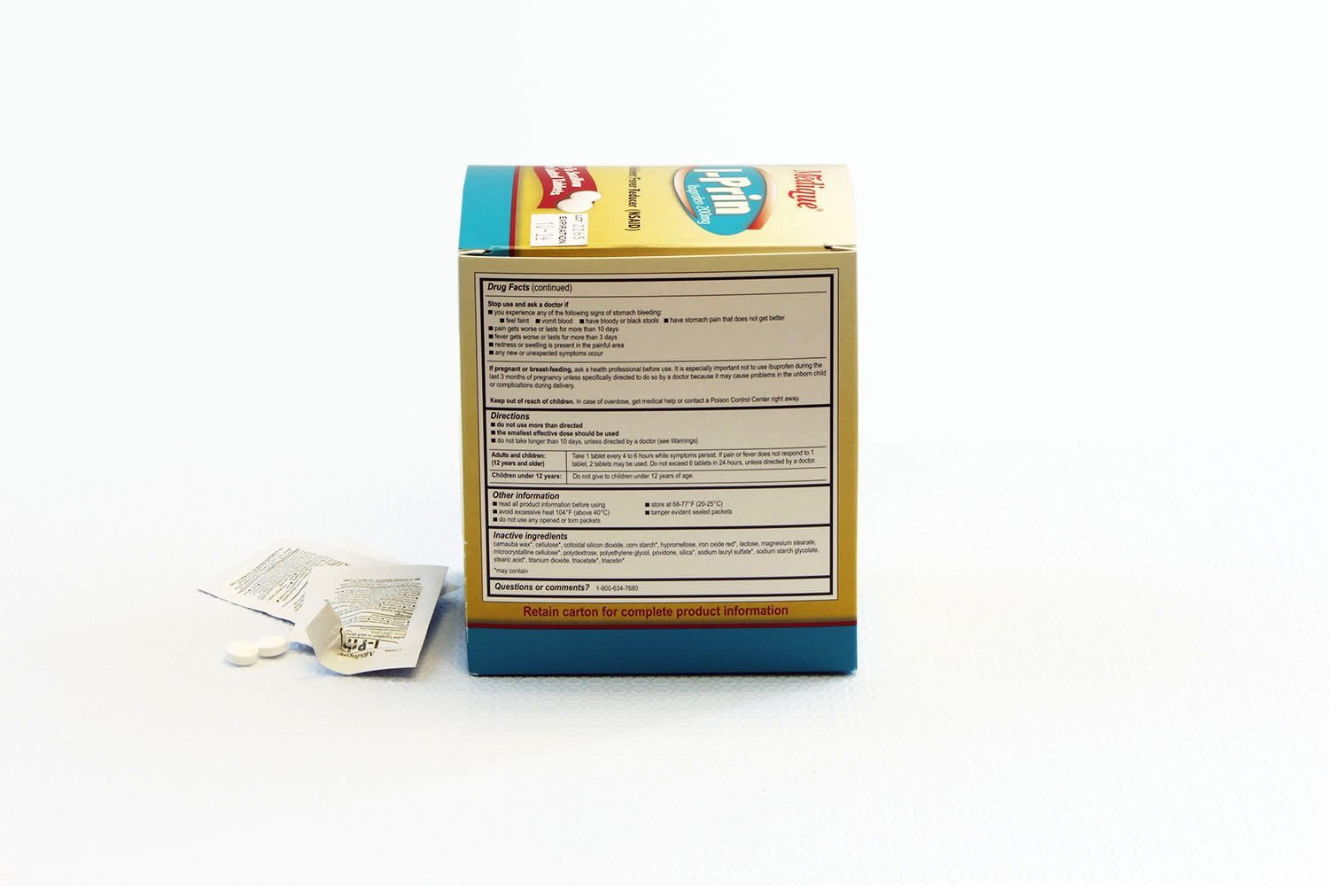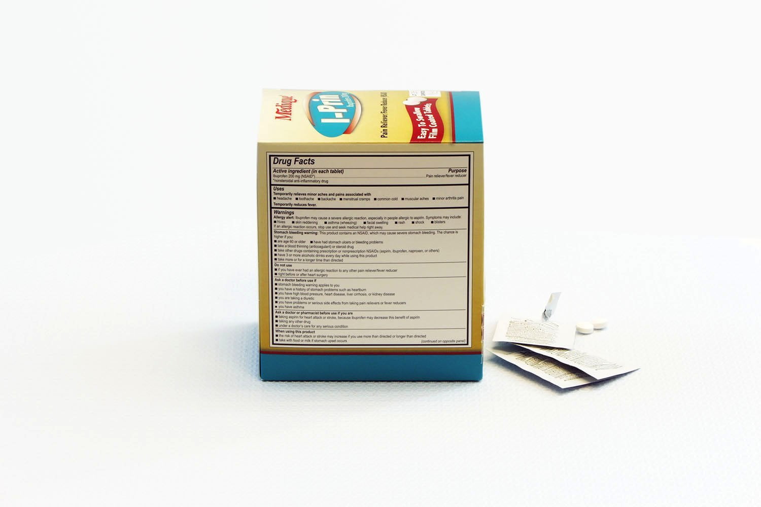 - Two tablets per packet, 100 packets per handy dispenser carton, for a total of 200 ibuprofen